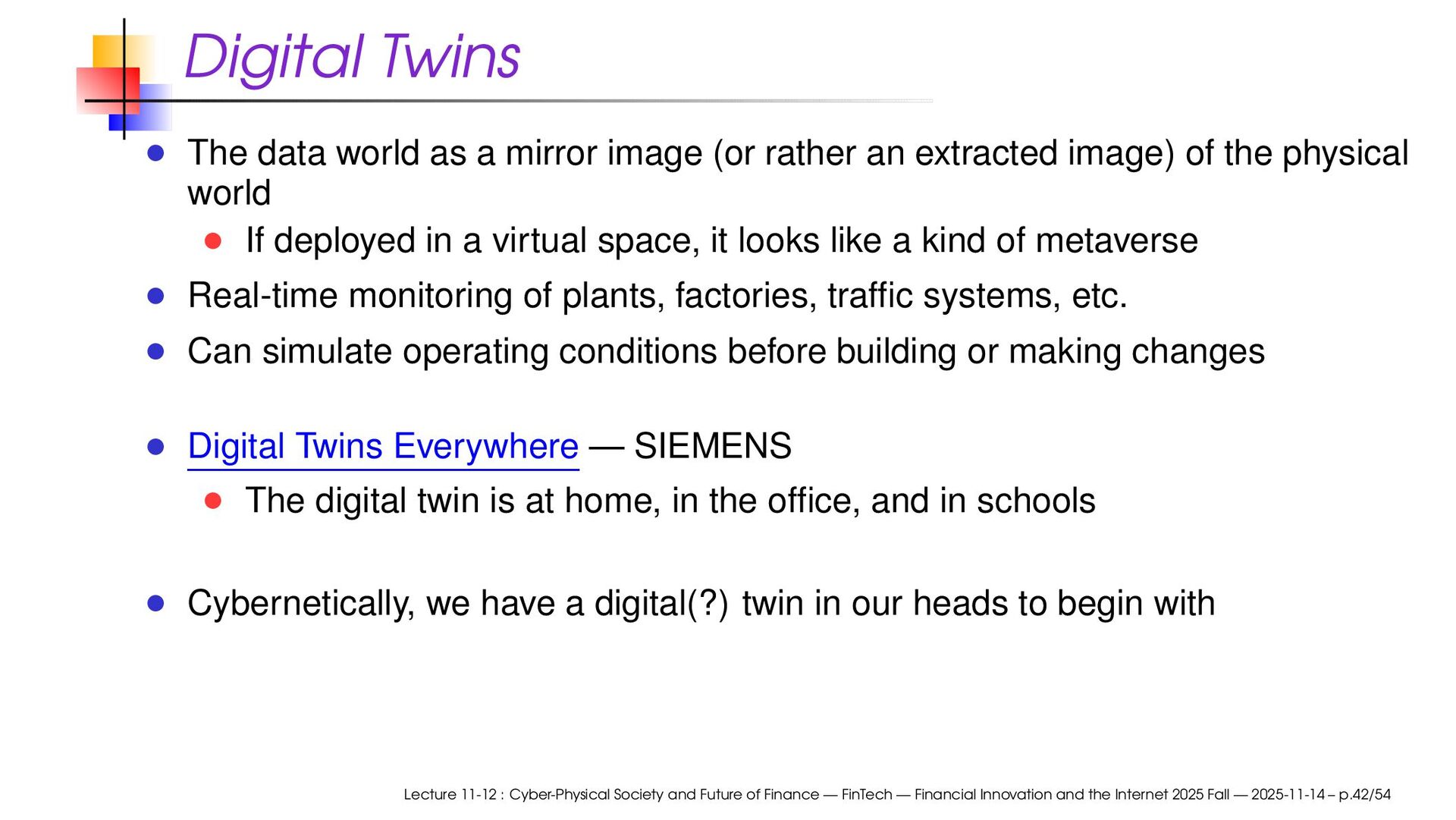 rather an extracted image) of the physical world If deployed in a virtual space, it looks like a kind of metaverse Real-time monitoring of plants, factories, traffic systems, etc. Can simulate operating conditions before building or making changes Digital Twins Everywhere — SIEMENS The digital twin is at home, in the office, and in schools Cybernetically, we have a digital(?) twin in our heads to begin with Lecture 11-12 : Cyber-Physical Society and Future of Finance — FinTech — Financial Innovation and the Internet 2025 Fall — 2025-11-14 – p.42/54