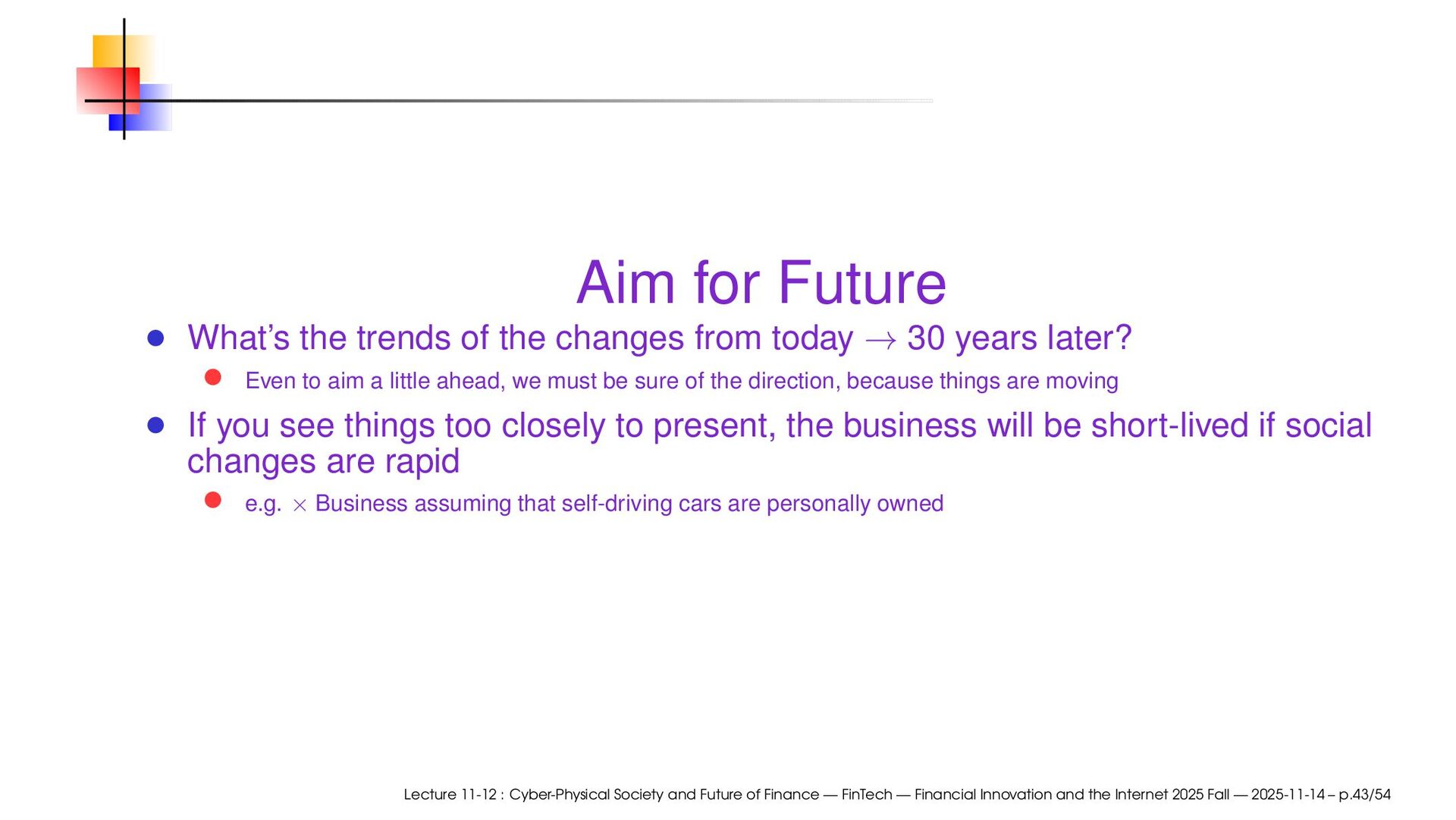 today → 30 years later? Even to aim a little ahead, we must be sure of the direction, because things are moving If you see things too closely to present, the business will be short-lived if social changes are rapid e.g. × Business assuming that self-driving cars are personally owned Lecture 11-12 : Cyber-Physical Society and Future of Finance — FinTech — Financial Innovation and the Internet 2025 Fall — 2025-11-14 – p.43/54