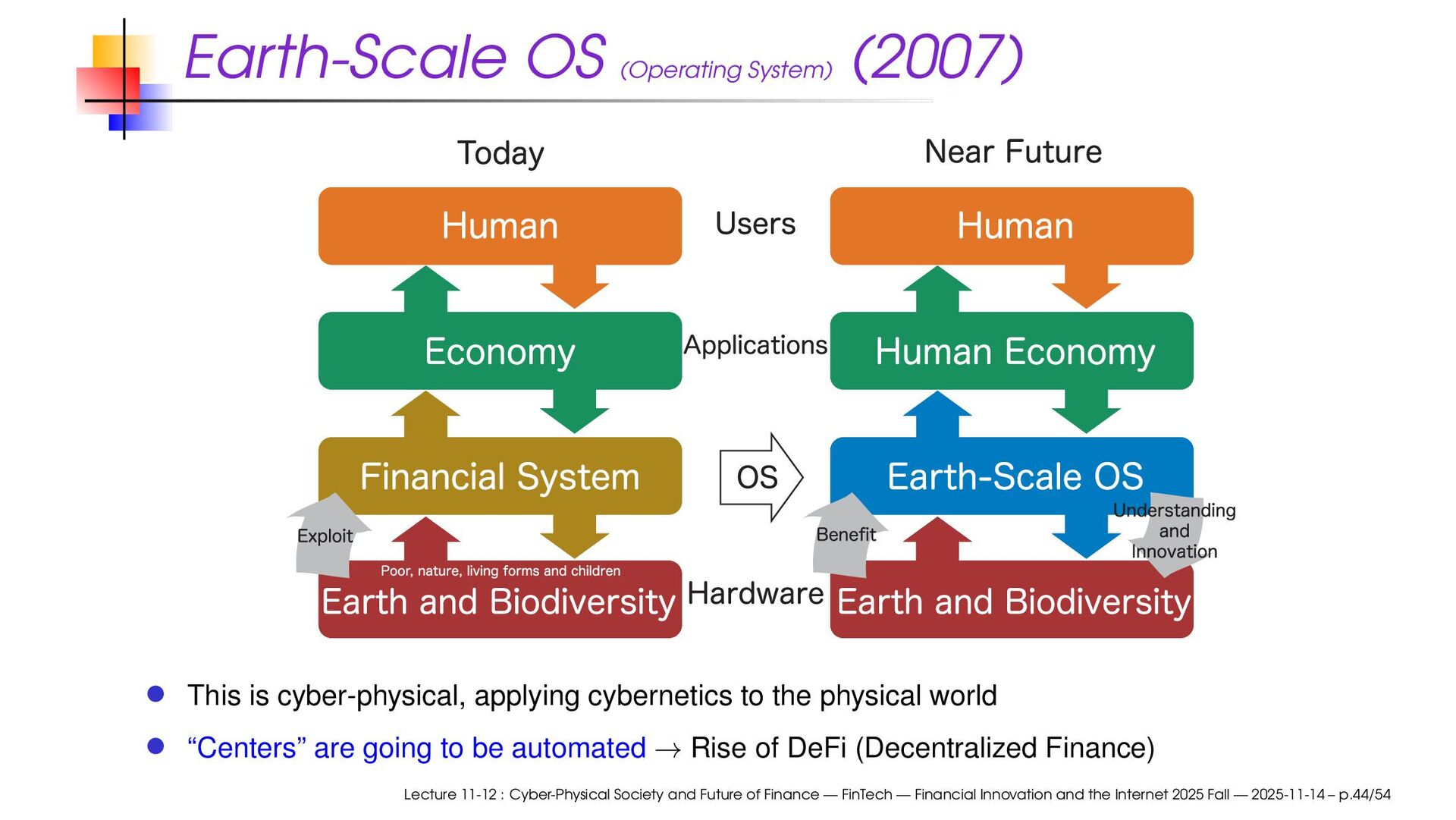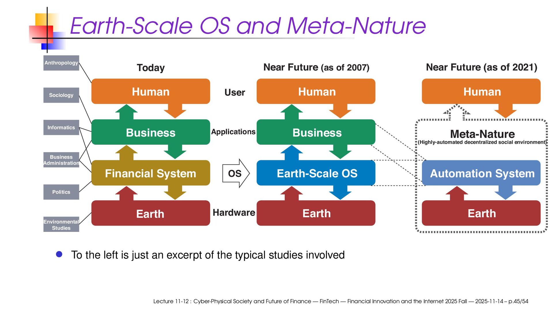 Administration Politics Today Hardware Applications User OS Human Business Financial System Human Business Earth-Scale OS Automation System Earth Earth Near Future (as of 2007) Human Meta-Nature (Highly-automated decentralized social environment) Earth Near Future (as of 2021) To the left is just an excerpt of the typical studies involved Lecture 11-12 : Cyber-Physical Society and Future of Finance — FinTech — Financial Innovation and the Internet 2025 Fall — 2025-11-14 – p.45/54