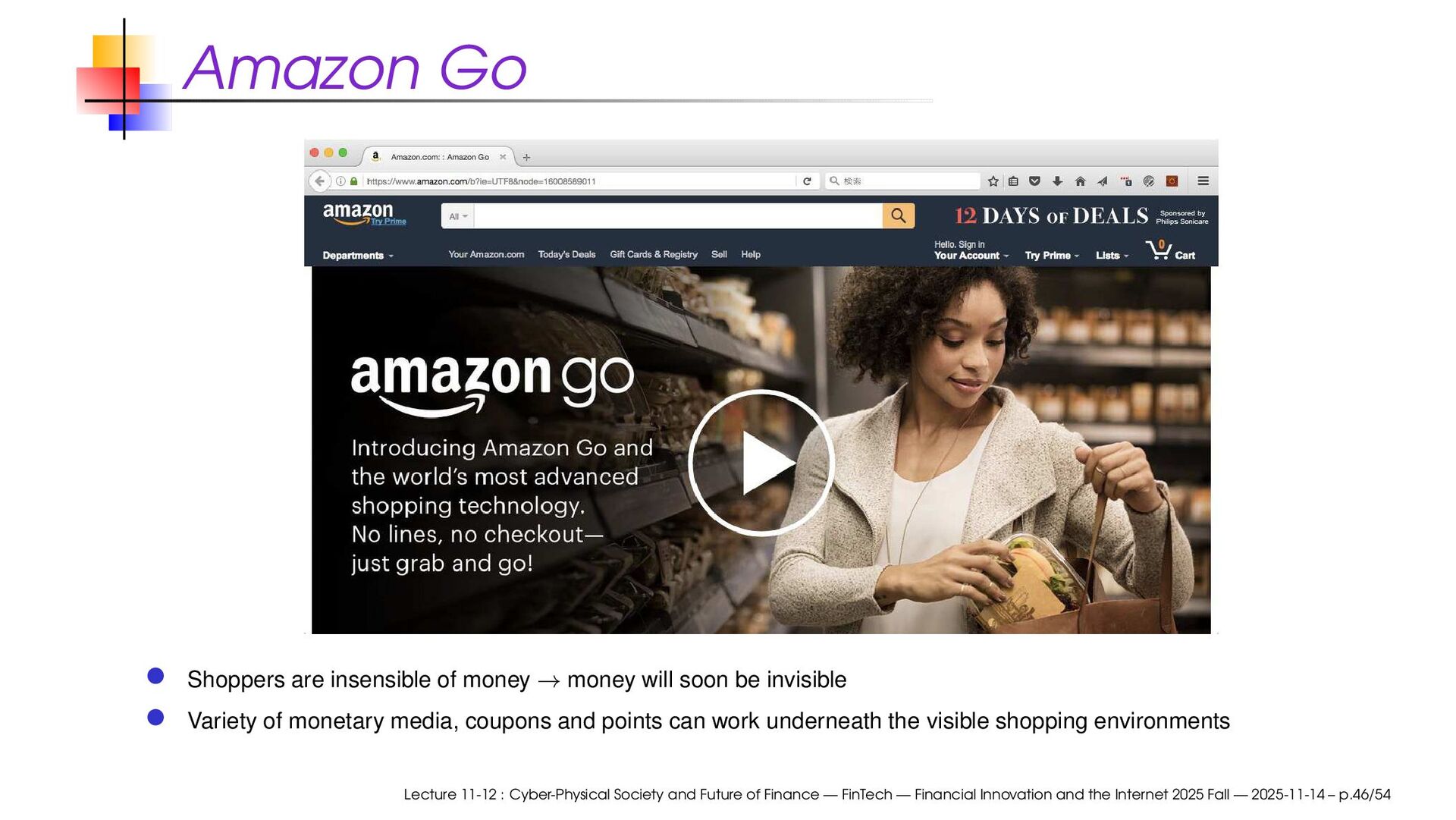 soon be invisible Variety of monetary media, coupons and points can work underneath the visible shopping environments Lecture 11-12 : Cyber-Physical Society and Future of Finance — FinTech — Financial Innovation and the Internet 2025 Fall — 2025-11-14 – p.46/54