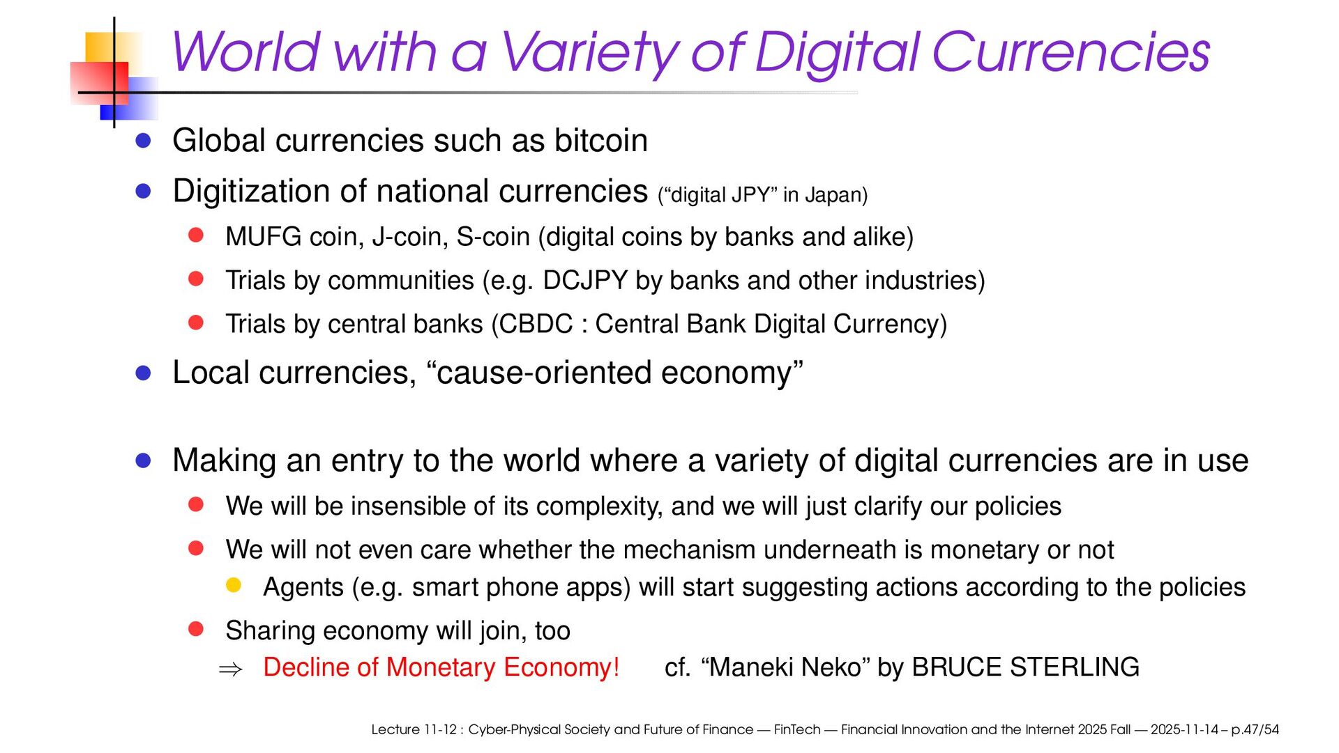 as bitcoin Digitization of national currencies (“digital JPY” in Japan) MUFG coin, J-coin, S-coin (digital coins by banks and alike) Trials by communities (e.g. DCJPY by banks and other industries) Trials by central banks (CBDC : Central Bank Digital Currency) Local currencies, “cause-oriented economy” Making an entry to the world where a variety of digital currencies are in use We will be insensible of its complexity, and we will just clarify our policies We will not even care whether the mechanism underneath is monetary or not Agents (e.g. smart phone apps) will start suggesting actions according to the policies Sharing economy will join, too ⇒ Decline of Monetary Economy! cf. “Maneki Neko” by BRUCE STERLING Lecture 11-12 : Cyber-Physical Society and Future of Finance — FinTech — Financial Innovation and the Internet 2025 Fall — 2025-11-14 – p.47/54