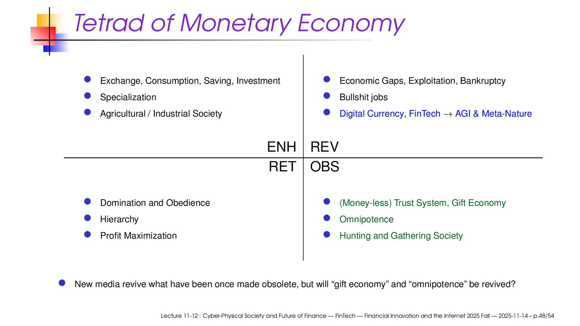/ Industrial Society Economic Gaps, Exploitation, Bankruptcy Bullshit jobs Digital Currency, FinTech → AGI & Meta-Nature ENH REV RET OBS Domination and Obedience Hierarchy Profit Maximization (Money-less) Trust System, Gift Economy Omnipotence Hunting and Gathering Society New media revive what have been once made obsolete, but will “gift economy” and “omnipotence” be revived? Lecture 11-12 : Cyber-Physical Society and Future of Finance — FinTech — Financial Innovation and the Internet 2025 Fall — 2025-11-14 – p.48/54