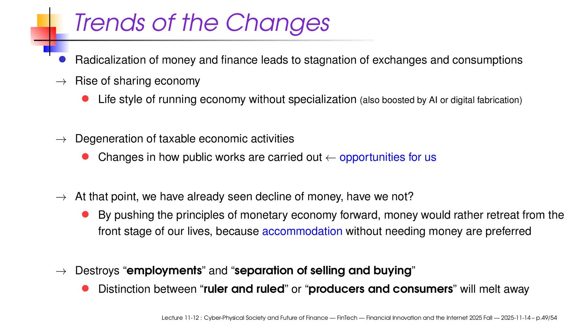 to stagnation of exchanges and consumptions → Rise of sharing economy Life style of running economy without specialization (also boosted by AI or digital fabrication) → Degeneration of taxable economic activities Changes in how public works are carried out ← opportunities for us → At that point, we have already seen decline of money, have we not? By pushing the principles of monetary economy forward, money would rather retreat from the front stage of our lives, because accommodation without needing money are preferred → Destroys “employments” and “separation of selling and buying” Distinction between “ruler and ruled” or “producers and consumers” will melt away Lecture 11-12 : Cyber-Physical Society and Future of Finance — FinTech — Financial Innovation and the Internet 2025 Fall — 2025-11-14 – p.49/54
