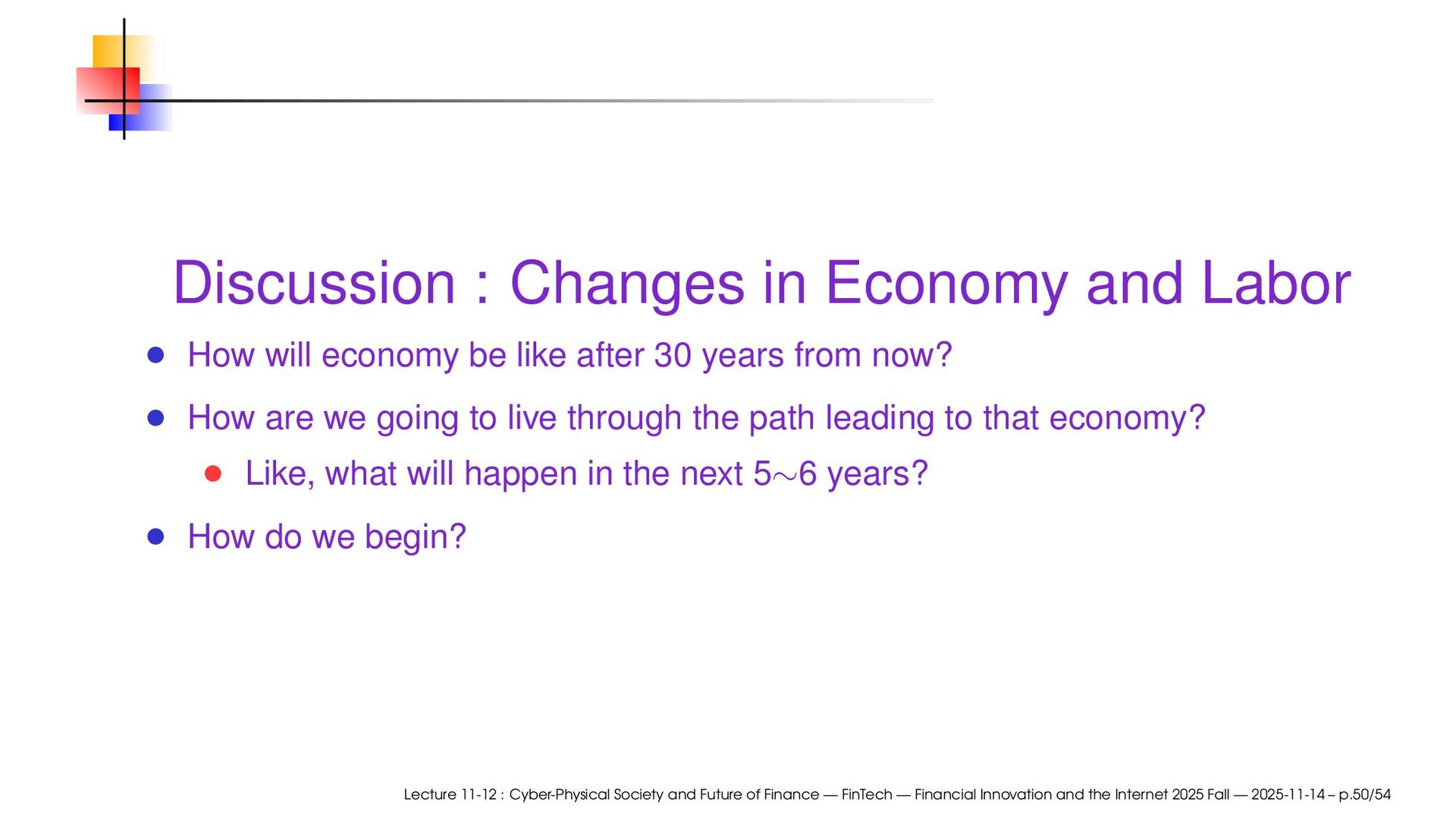 be like after 30 years from now? How are we going to live through the path leading to that economy? Like, what will happen in the next 5∼6 years? How do we begin? Lecture 11-12 : Cyber-Physical Society and Future of Finance — FinTech — Financial Innovation and the Internet 2025 Fall — 2025-11-14 – p.50/54