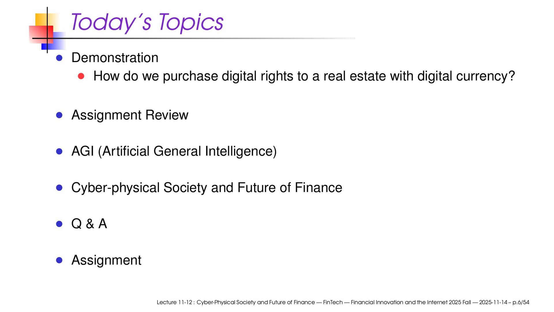 a real estate with digital currency? Assignment Review AGI (Artificial General Intelligence) Cyber-physical Society and Future of Finance Q & A Assignment Lecture 11-12 : Cyber-Physical Society and Future of Finance — FinTech — Financial Innovation and the Internet 2025 Fall — 2025-11-14 – p.6/54
