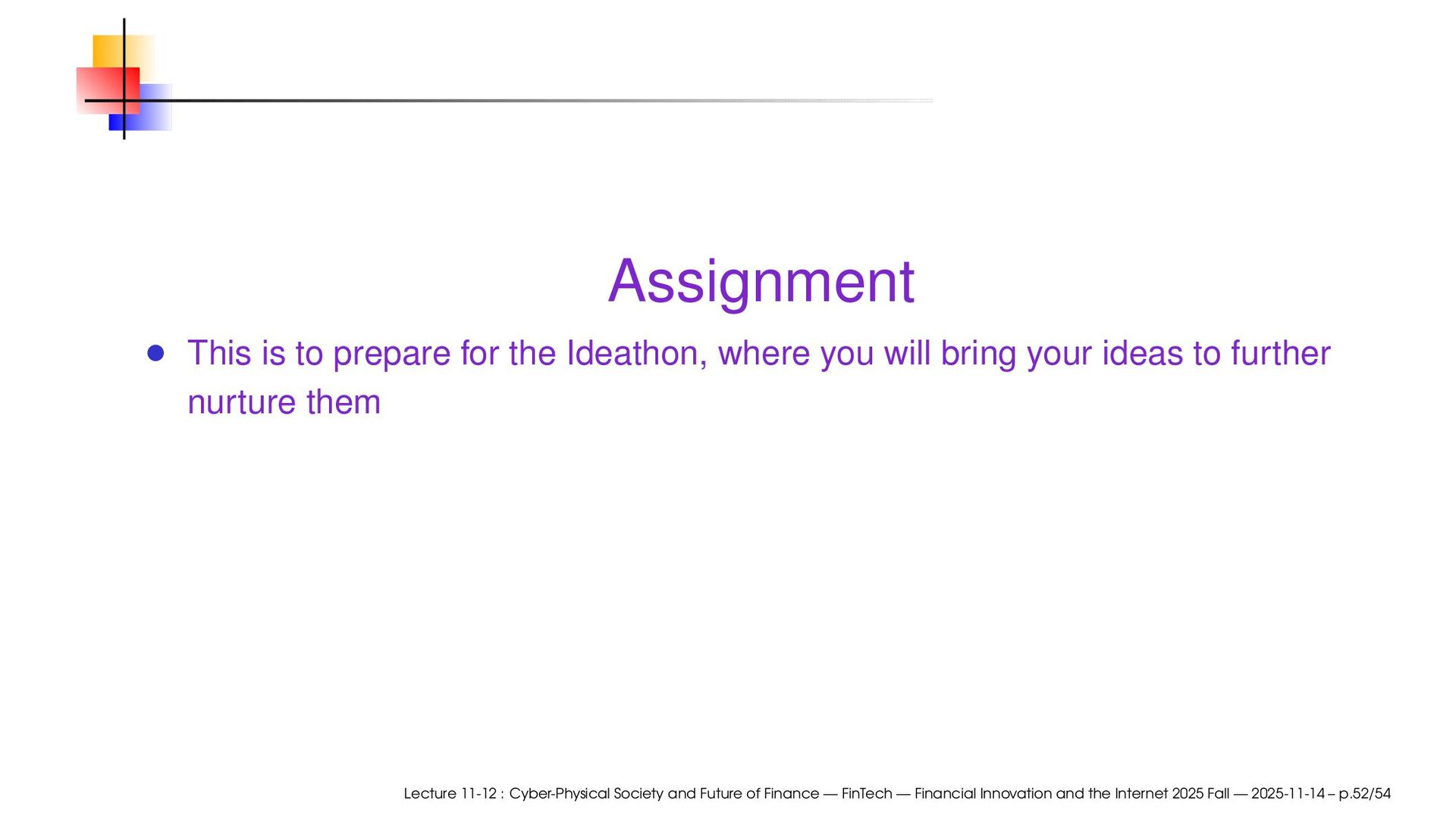 will bring your ideas to further nurture them Lecture 11-12 : Cyber-Physical Society and Future of Finance — FinTech — Financial Innovation and the Internet 2025 Fall — 2025-11-14 – p.52/54
