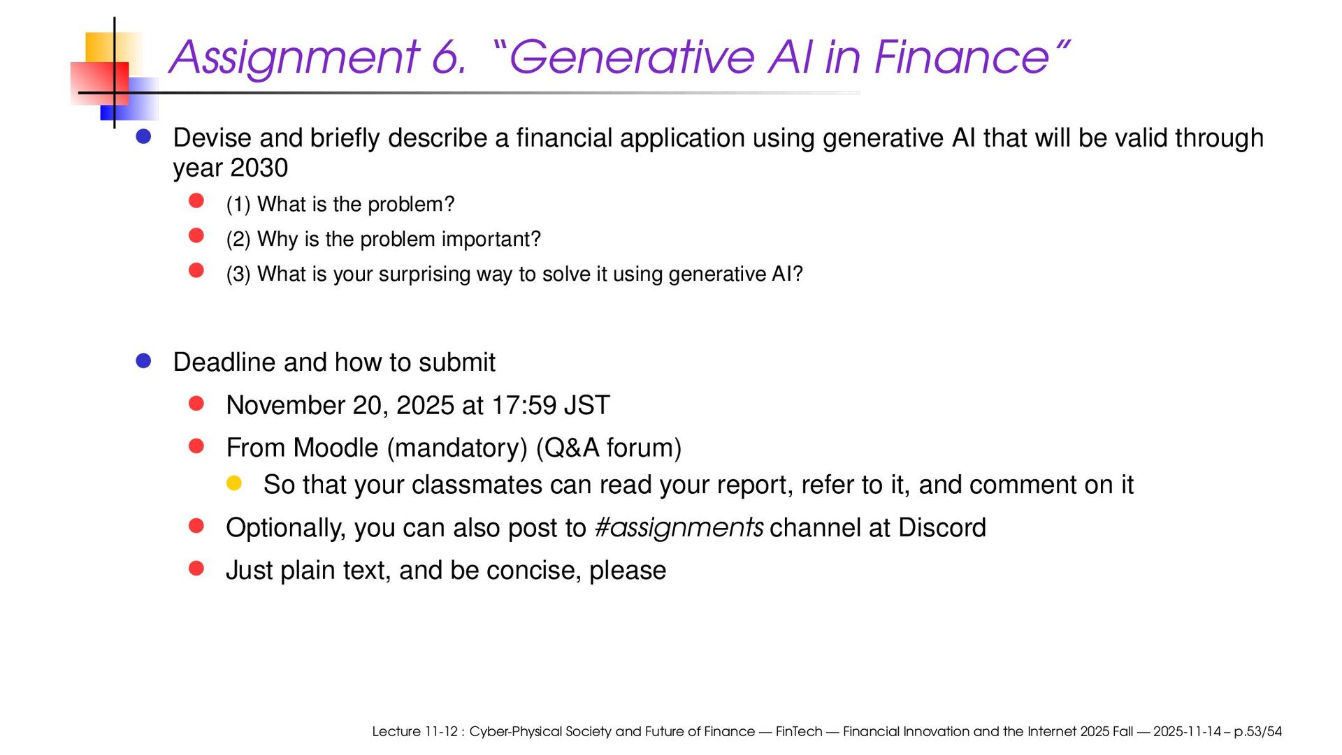 a financial application using generative AI that will be valid through year 2030 (1) What is the problem? (2) Why is the problem important? (3) What is your surprising way to solve it using generative AI? Deadline and how to submit November 20, 2025 at 17:59 JST From Moodle (mandatory) (Q&A forum) So that your classmates can read your report, refer to it, and comment on it Optionally, you can also post to #assignments channel at Discord Just plain text, and be concise, please Lecture 11-12 : Cyber-Physical Society and Future of Finance — FinTech — Financial Innovation and the Internet 2025 Fall — 2025-11-14 – p.53/54