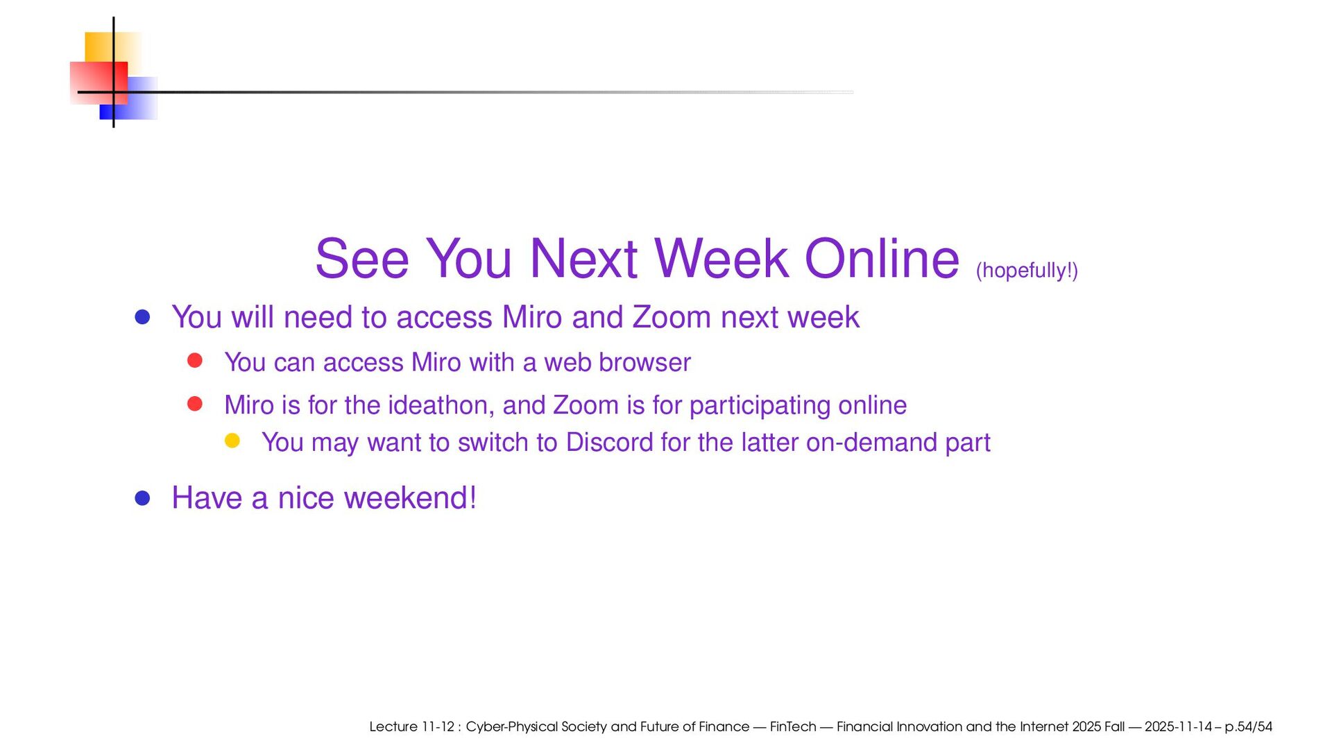 access Miro and Zoom next week You can access Miro with a web browser Miro is for the ideathon, and Zoom is for participating online You may want to switch to Discord for the latter on-demand part Have a nice weekend! Lecture 11-12 : Cyber-Physical Society and Future of Finance — FinTech — Financial Innovation and the Internet 2025 Fall — 2025-11-14 – p.54/54
