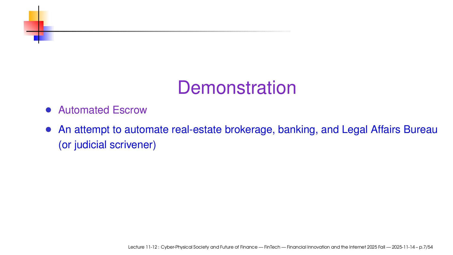 7. Demonstration Automated Escrow An attempt to automate real-estate brokerage, banking,
