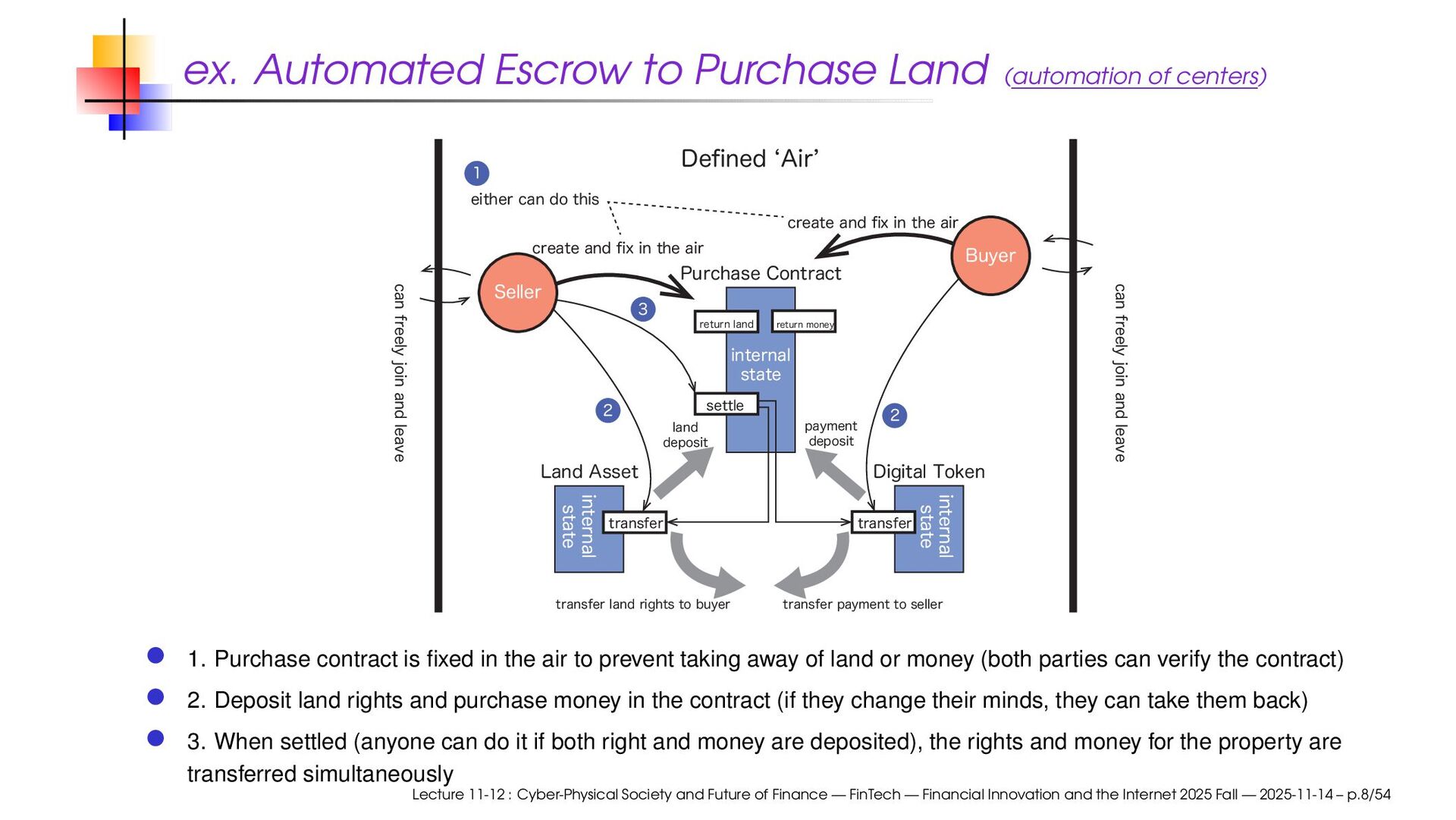 SFUVSOMBOE 1VSDIBTF$POUSBDU -BOE"TTFU MBOE EFQPTJU USBOTGFSMBOESJHIUTUPCVZFS USBOTGFSQBZNFOUUPTFMMFS QBZNFOU EFQPTJU %JHJUBM5PLFO DSFBUFBOEpYJOUIFBJS FJUIFSDBOEPUIJT DSFBUFBOEpYJOUIFBJS DBOGSFFMZKPJOBOEMFBWF DBOGSFFMZKPJOBOEMFBWF 4FMMFS #VZFS JOUFSOBM TUBUF SFUVSONPOFZ TFUUMF USBOTGFS JOUFSOBM TUBUF USBOTGFS JOUFSOBM TUBUF     1. Purchase contract is fixed in the air to prevent taking away of land or money (both parties can verify the contract) 2. Deposit land rights and purchase money in the contract (if they change their minds, they can take them back) 3. When settled (anyone can do it if both right and money are deposited), the rights and money for the property are transferred simultaneously Lecture 11-12 : Cyber-Physical Society and Future of Finance — FinTech — Financial Innovation and the Internet 2025 Fall — 2025-11-14 – p.8/54