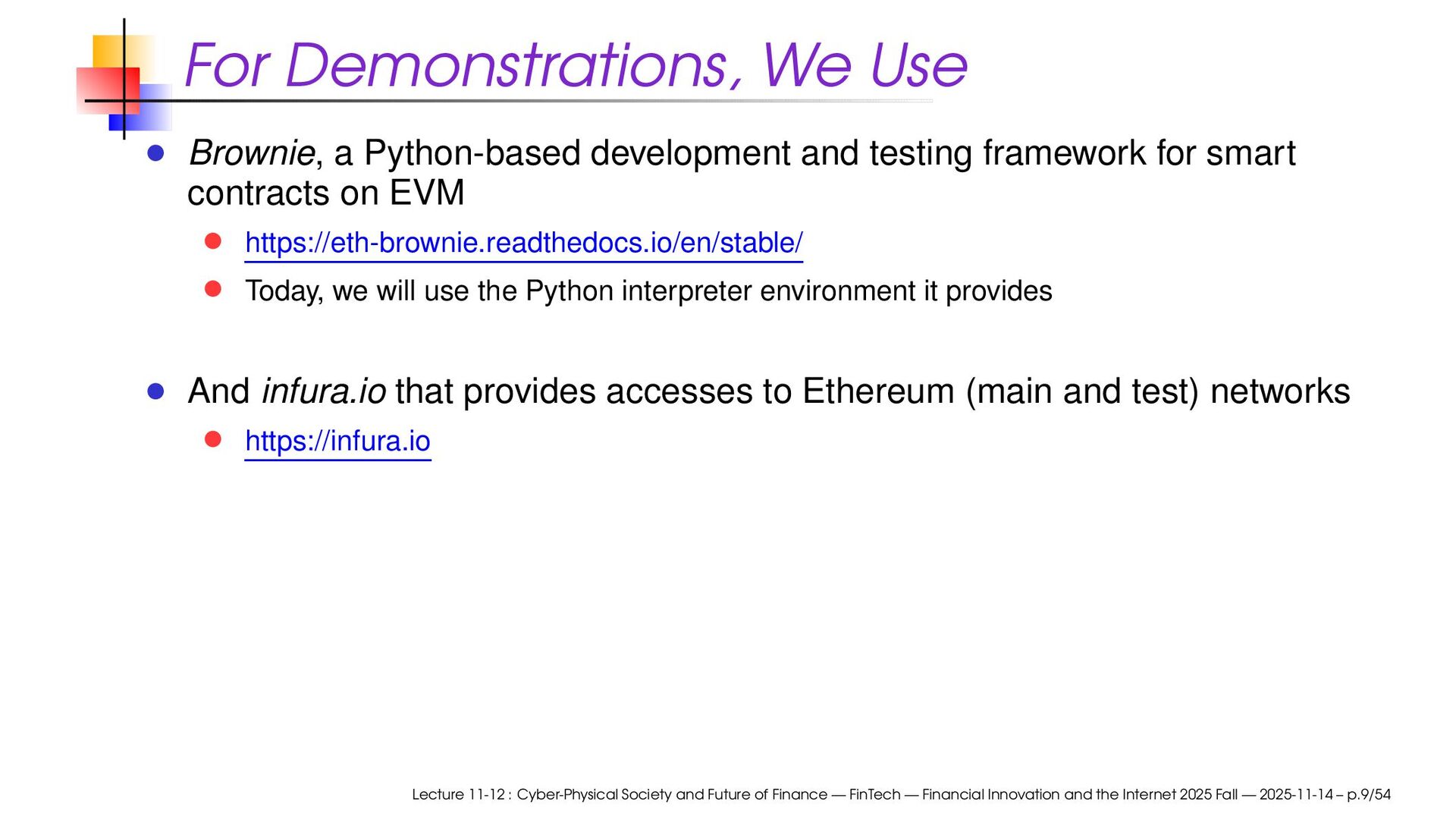 framework for smart contracts on EVM https://eth-brownie.readthedocs.io/en/stable/ Today, we will use the Python interpreter environment it provides And infura.io that provides accesses to Ethereum (main and test) networks https://infura.io Lecture 11-12 : Cyber-Physical Society and Future of Finance — FinTech — Financial Innovation and the Internet 2025 Fall — 2025-11-14 – p.9/54