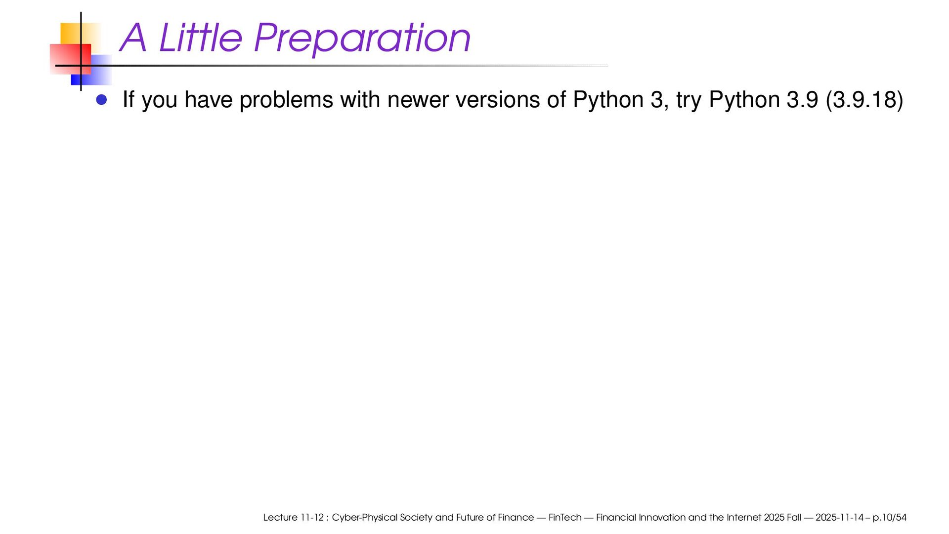 of Python 3, try Python 3.9 (3.9.18) Lecture 11-12 : Cyber-Physical Society and Future of Finance — FinTech — Financial Innovation and the Internet 2025 Fall — 2025-11-14 – p.10/54