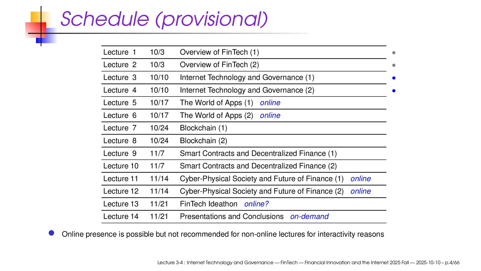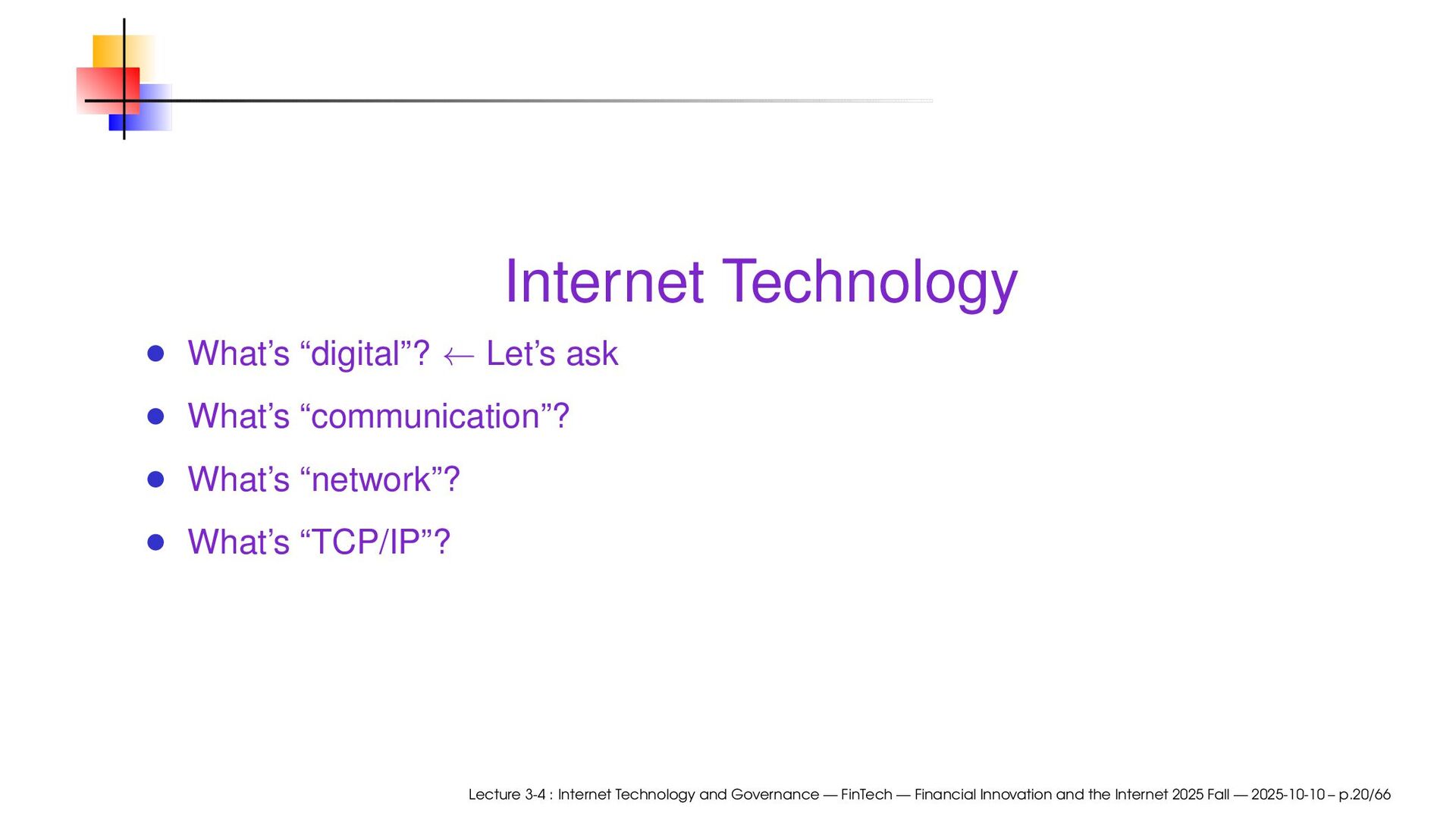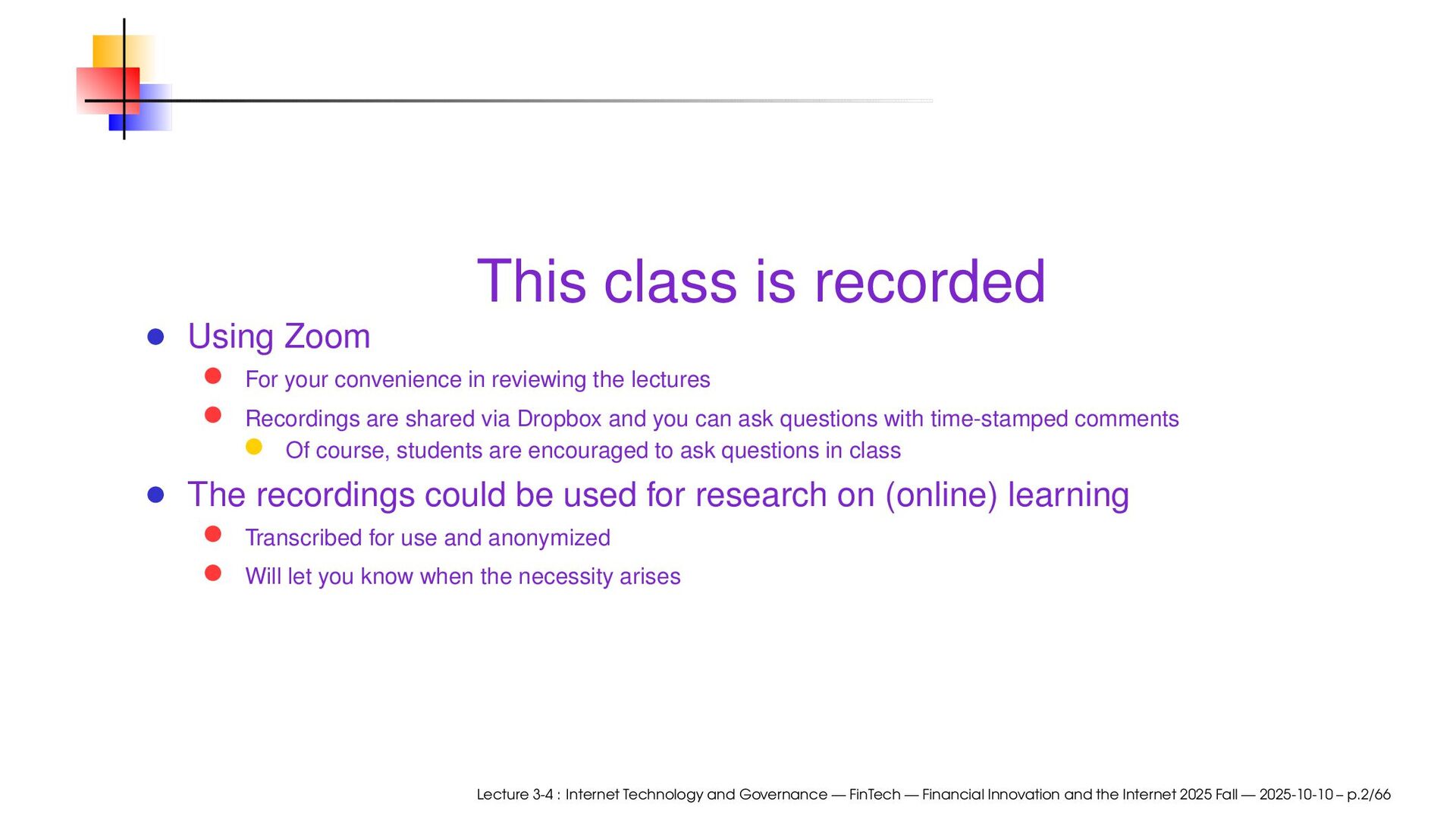 reviewing the lectures Recordings are shared via Dropbox and you can ask questions with time-stamped comments Of course, students are encouraged to ask questions in class The recordings could be used for research on (online) learning Transcribed for use and anonymized Will let you know when the necessity arises Lecture 3-4 : Internet Technology and Governance — FinTech — Financial Innovation and the Internet 2025 Fall — 2025-10-10 – p.2/66