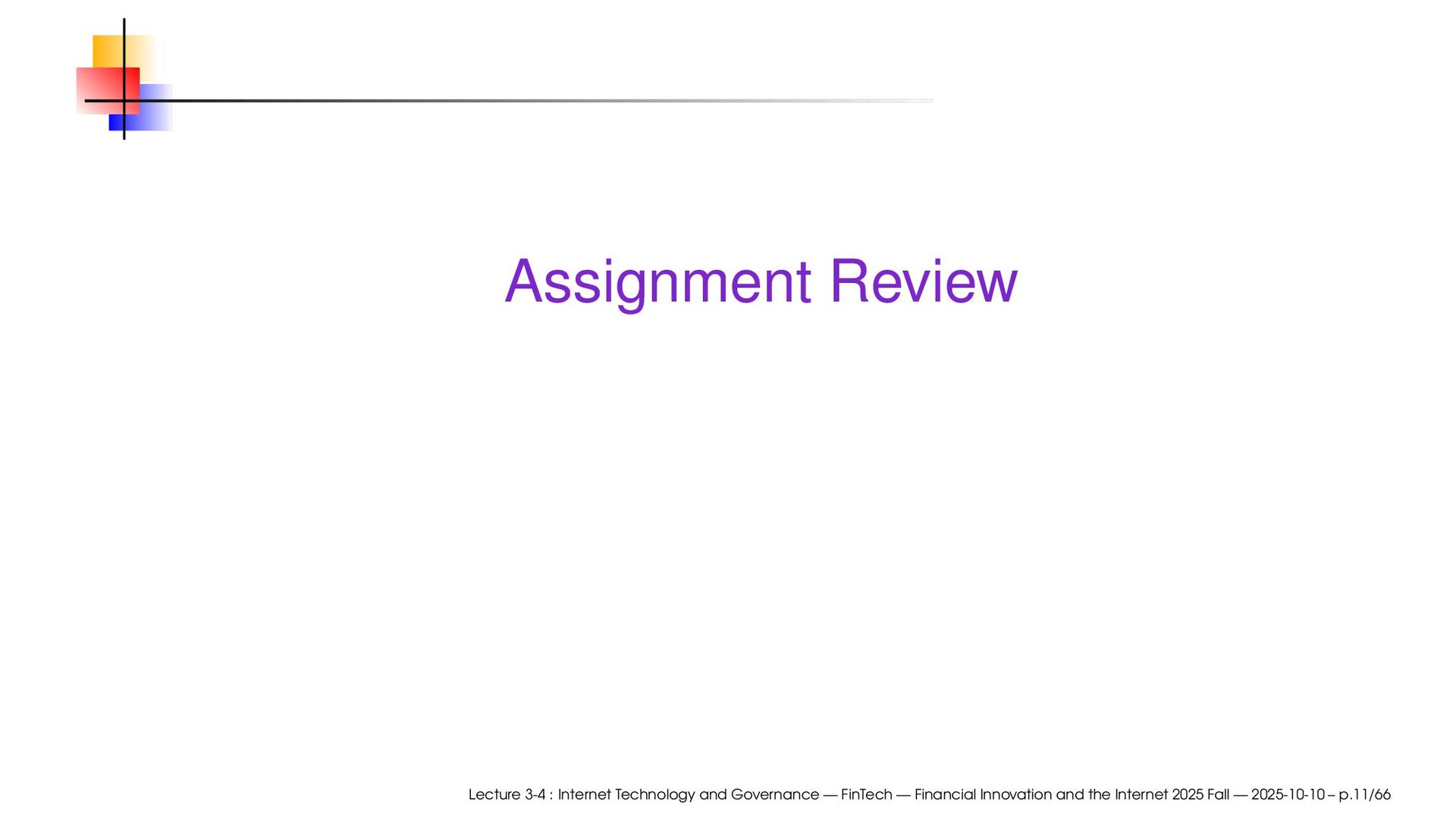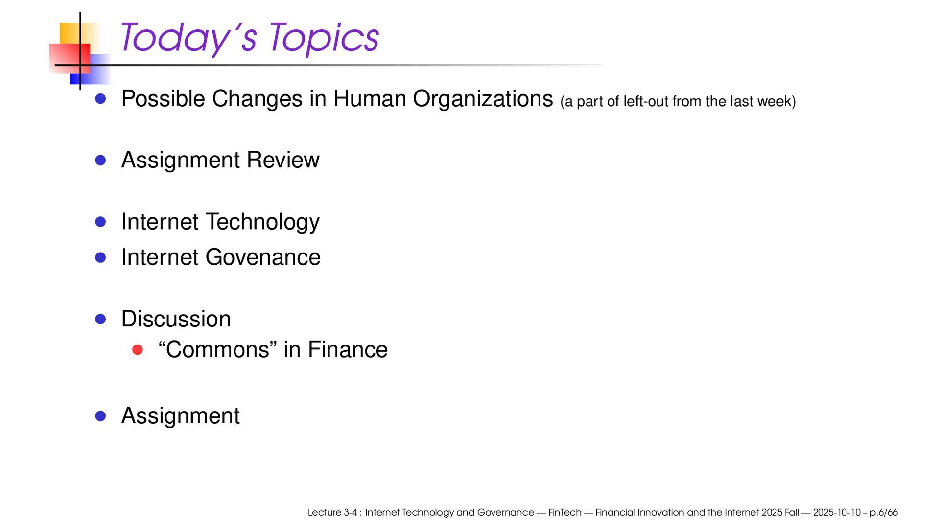 left-out from the last week) Assignment Review Internet Technology Internet Govenance Discussion “Commons” in Finance Assignment Lecture 3-4 : Internet Technology and Governance — FinTech — Financial Innovation and the Internet 2025 Fall — 2025-10-10 – p.6/66