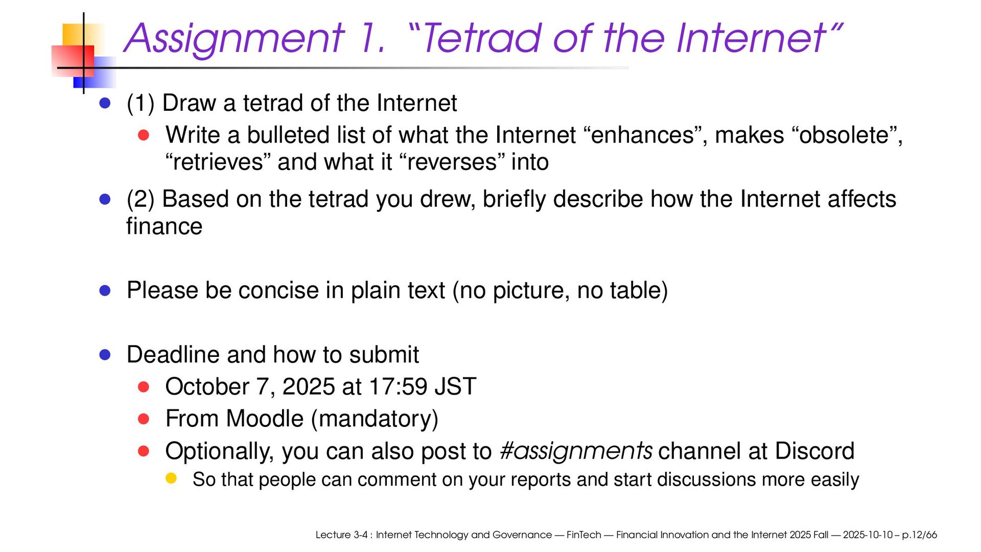 of the Internet Write a bulleted list of what the Internet “enhances”, makes “obsolete”, “retrieves” and what it “reverses” into (2) Based on the tetrad you drew, briefly describe how the Internet affects finance Please be concise in plain text (no picture, no table) Deadline and how to submit October 7, 2025 at 17:59 JST From Moodle (mandatory) Optionally, you can also post to #assignments channel at Discord So that people can comment on your reports and start discussions more easily Lecture 3-4 : Internet Technology and Governance — FinTech — Financial Innovation and the Internet 2025 Fall — 2025-10-10 – p.12/66