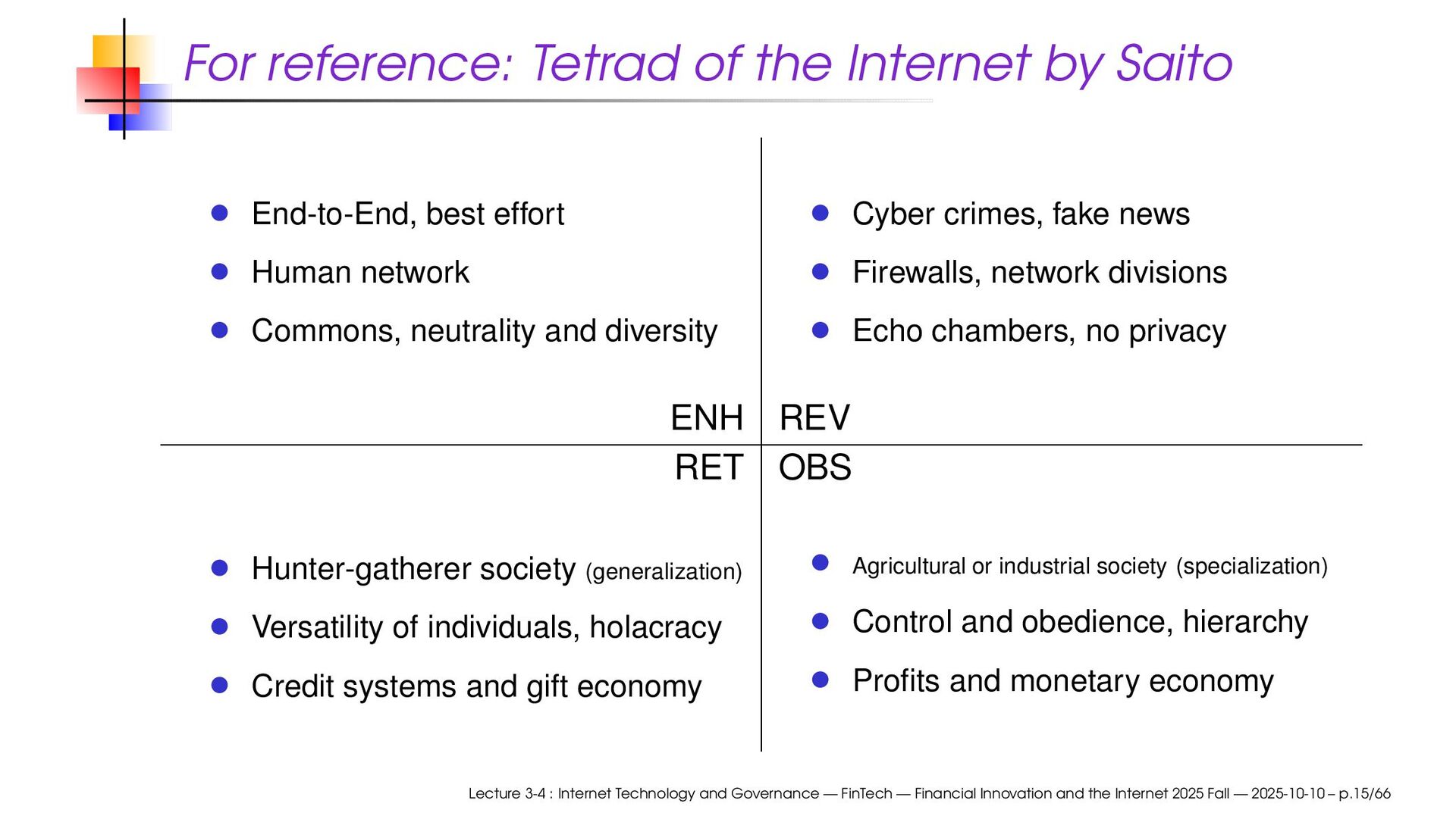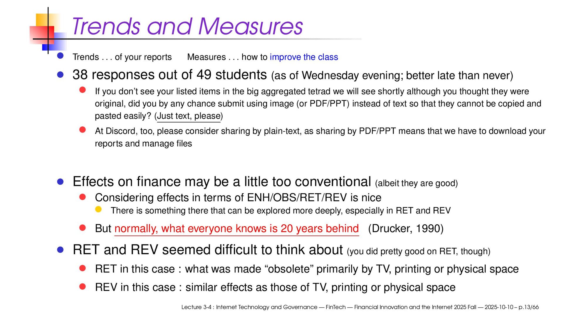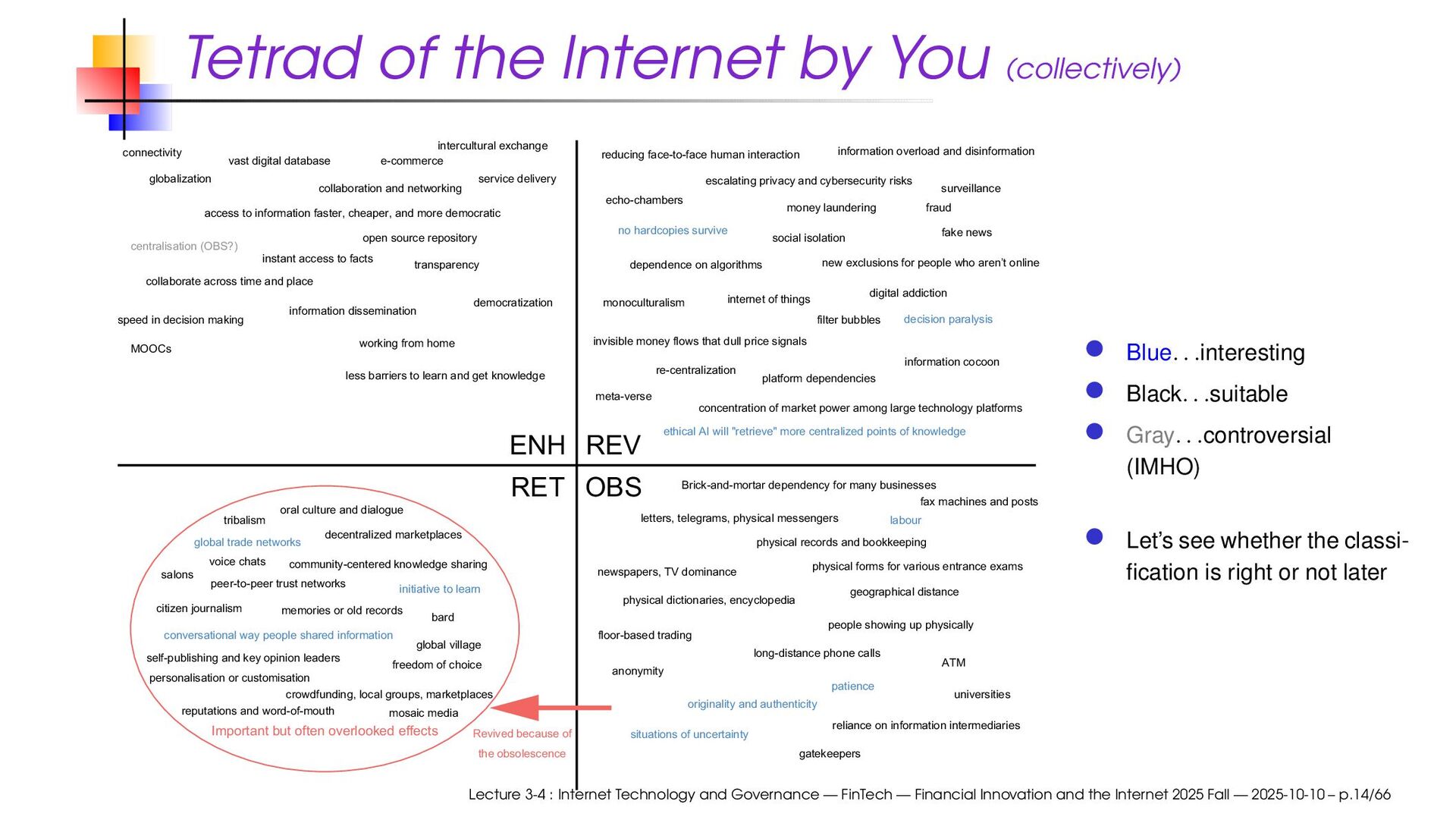 Measures . . . how to improve the class 38 responses out of 49 students (as of Wednesday evening; better late than never) If you don’t see your listed items in the big aggregated tetrad we will see shortly although you thought they were original, did you by any chance submit using image (or PDF/PPT) instead of text so that they cannot be copied and pasted easily? (Just text, please) At Discord, too, please consider sharing by plain-text, as sharing by PDF/PPT means that we have to download your reports and manage files Effects on finance may be a little too conventional (albeit they are good) Considering effects in terms of ENH/OBS/RET/REV is nice There is something there that can be explored more deeply, especially in RET and REV But normally, what everyone knows is 20 years behind (Drucker, 1990) RET and REV seemed difficult to think about (you did pretty good on RET, though) RET in this case : what was made “obsolete” primarily by TV, printing or physical space REV in this case : similar effects as those of TV, printing or physical space Lecture 3-4 : Internet Technology and Governance — FinTech — Financial Innovation and the Internet 2025 Fall — 2025-10-10 – p.13/66