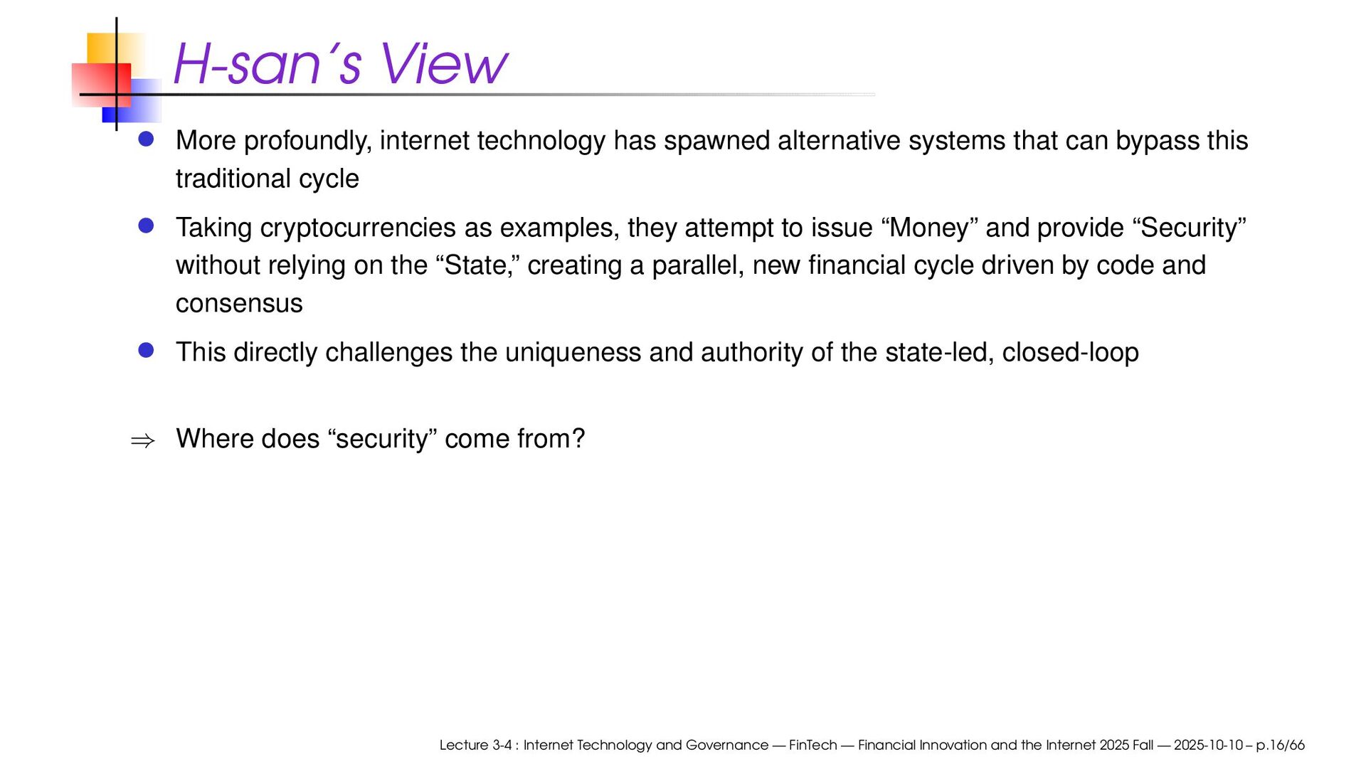 that can bypass this traditional cycle Taking cryptocurrencies as examples, they attempt to issue “Money” and provide “Security” without relying on the “State,” creating a parallel, new financial cycle driven by code and consensus This directly challenges the uniqueness and authority of the state-led, closed-loop ⇒ Where does “security” come from? Lecture 3-4 : Internet Technology and Governance — FinTech — Financial Innovation and the Internet 2025 Fall — 2025-10-10 – p.16/66