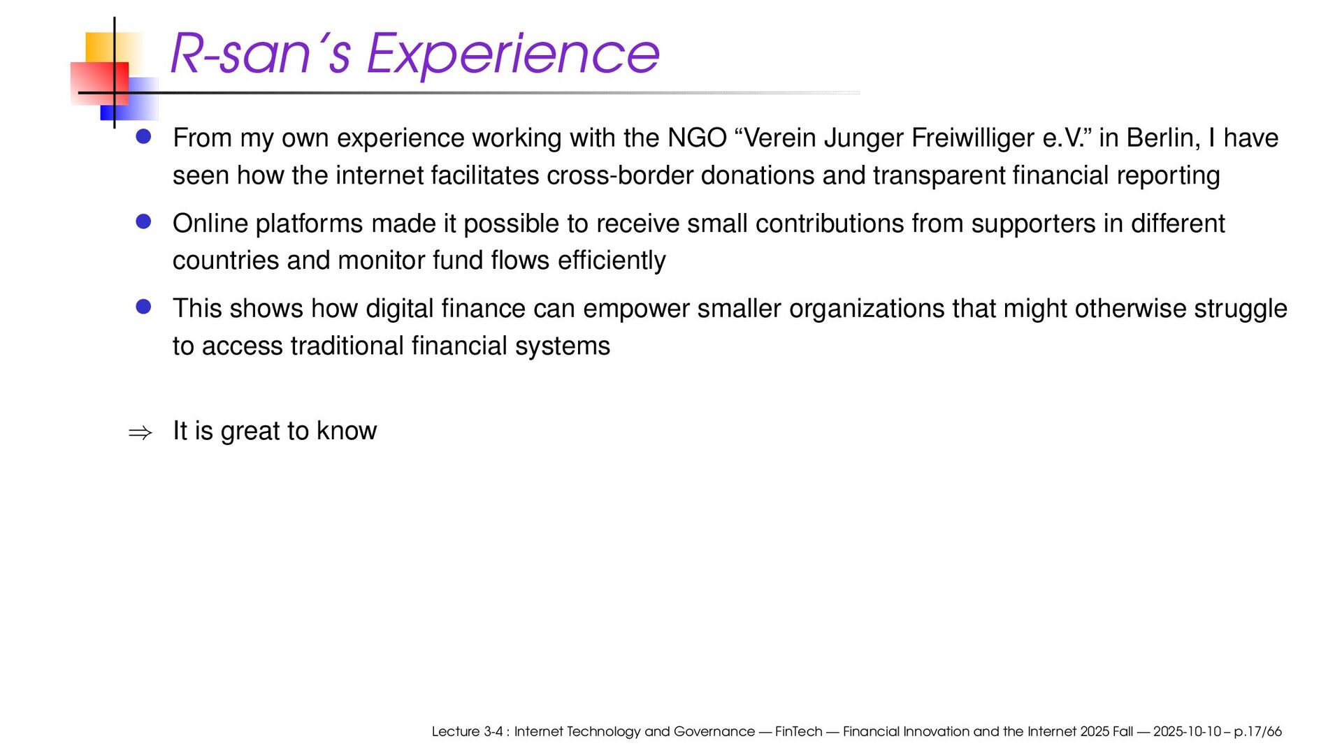 “Verein Junger Freiwilliger e.V.” in Berlin, I have seen how the internet facilitates cross-border donations and transparent financial reporting Online platforms made it possible to receive small contributions from supporters in different countries and monitor fund flows efficiently This shows how digital finance can empower smaller organizations that might otherwise struggle to access traditional financial systems ⇒ It is great to know Lecture 3-4 : Internet Technology and Governance — FinTech — Financial Innovation and the Internet 2025 Fall — 2025-10-10 – p.17/66