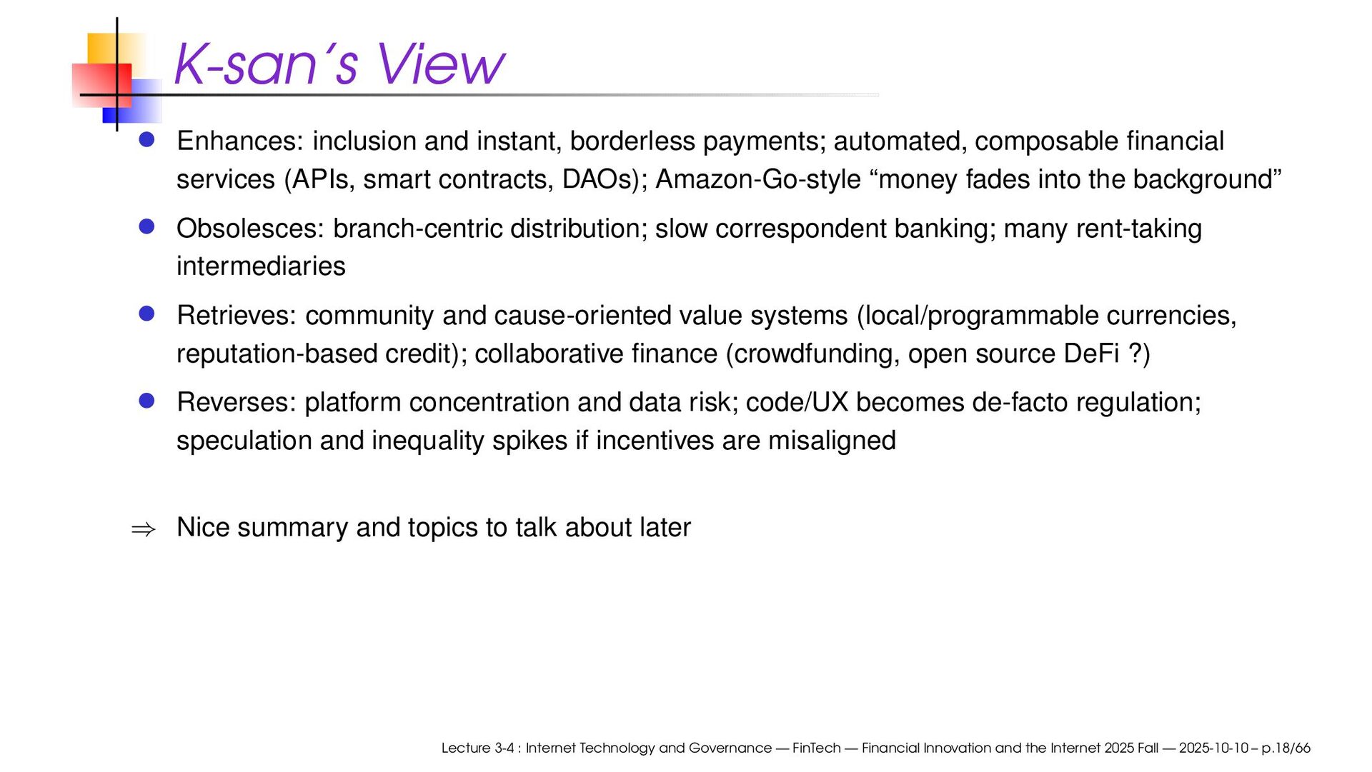 financial services (APIs, smart contracts, DAOs); Amazon-Go-style “money fades into the background” Obsolesces: branch-centric distribution; slow correspondent banking; many rent-taking intermediaries Retrieves: community and cause-oriented value systems (local/programmable currencies, reputation-based credit); collaborative finance (crowdfunding, open source DeFi ?) Reverses: platform concentration and data risk; code/UX becomes de-facto regulation; speculation and inequality spikes if incentives are misaligned ⇒ Nice summary and topics to talk about later Lecture 3-4 : Internet Technology and Governance — FinTech — Financial Innovation and the Internet 2025 Fall — 2025-10-10 – p.18/66
