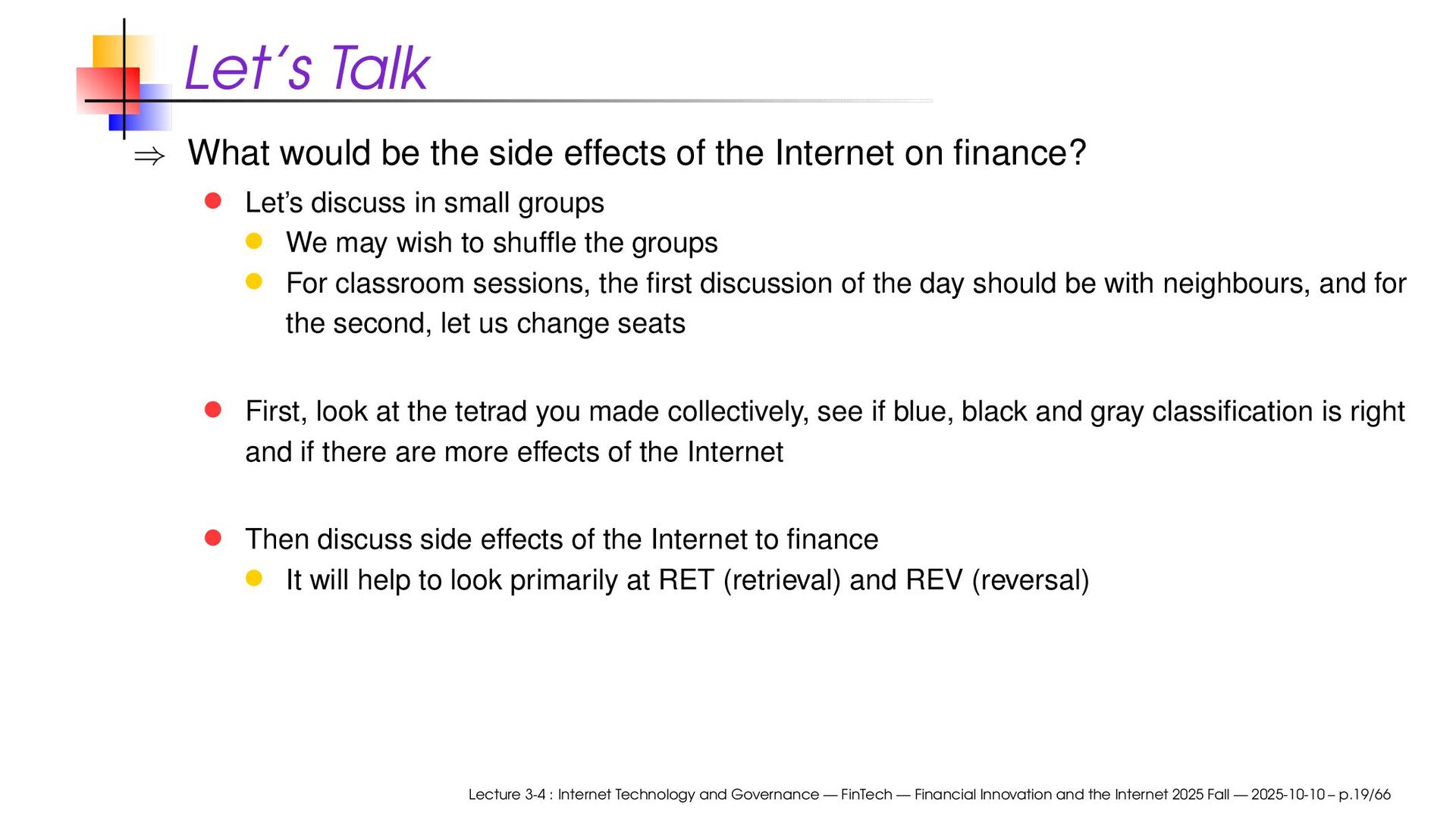 the Internet on finance? Let’s discuss in small groups We may wish to shuffle the groups For classroom sessions, the first discussion of the day should be with neighbours, and for the second, let us change seats First, look at the tetrad you made collectively, see if blue, black and gray classification is right and if there are more effects of the Internet Then discuss side effects of the Internet to finance It will help to look primarily at RET (retrieval) and REV (reversal) Lecture 3-4 : Internet Technology and Governance — FinTech — Financial Innovation and the Internet 2025 Fall — 2025-10-10 – p.19/66
