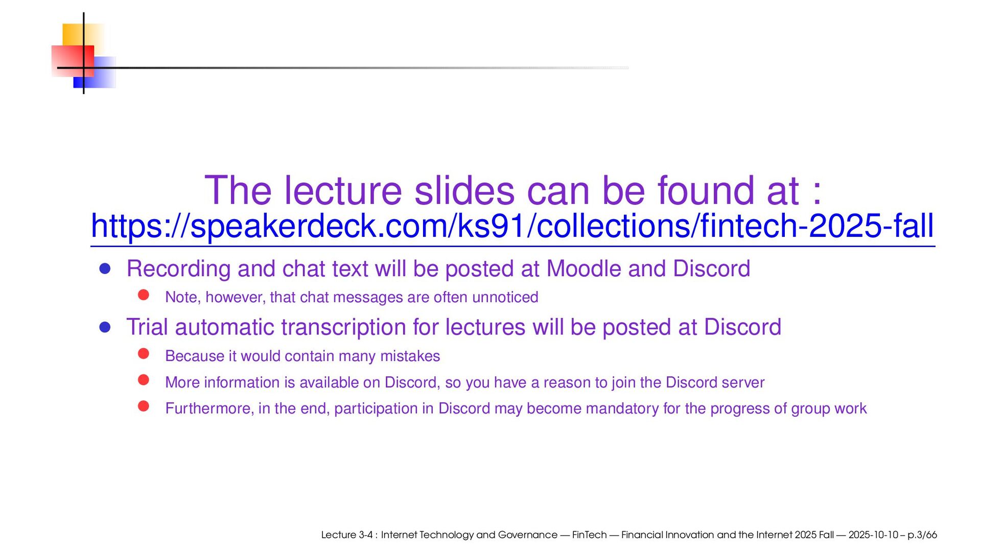 and chat text will be posted at Moodle and Discord Note, however, that chat messages are often unnoticed Trial automatic transcription for lectures will be posted at Discord Because it would contain many mistakes More information is available on Discord, so you have a reason to join the Discord server Furthermore, in the end, participation in Discord may become mandatory for the progress of group work Lecture 3-4 : Internet Technology and Governance — FinTech — Financial Innovation and the Internet 2025 Fall — 2025-10-10 – p.3/66