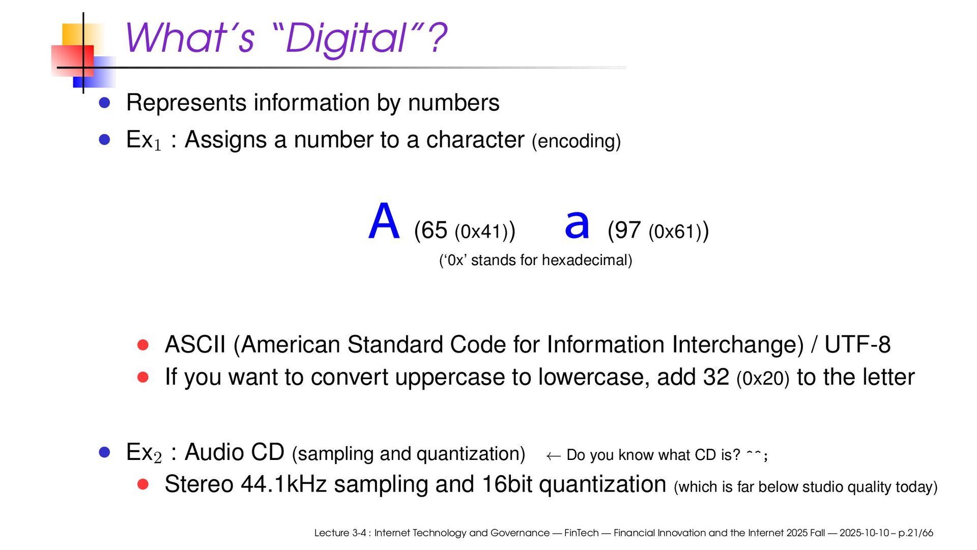 number to a character (encoding) (65 (0x41)) (97 (0x61)) (‘0x’ stands for hexadecimal) ASCII (American Standard Code for Information Interchange) / UTF-8 If you want to convert uppercase to lowercase, add 32 (0x20) to the letter Ex2 : Audio CD (sampling and quantization) ← Do you know what CD is? ^^; Stereo 44.1kHz sampling and 16bit quantization (which is far below studio quality today) Lecture 3-4 : Internet Technology and Governance — FinTech — Financial Innovation and the Internet 2025 Fall — 2025-10-10 – p.21/66