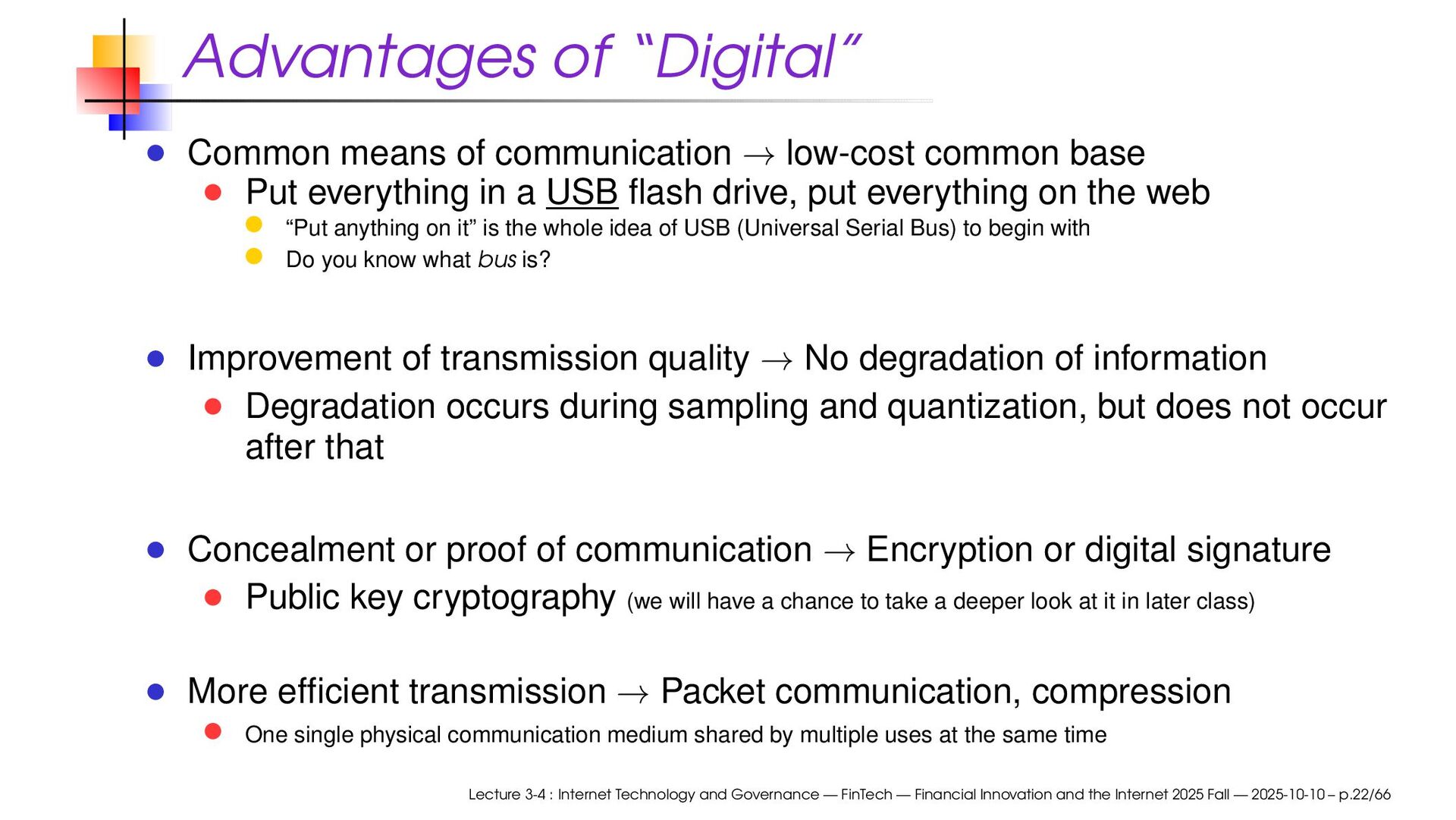 base Put everything in a USB flash drive, put everything on the web “Put anything on it” is the whole idea of USB (Universal Serial Bus) to begin with Do you know what bus is? Improvement of transmission quality → No degradation of information Degradation occurs during sampling and quantization, but does not occur after that Concealment or proof of communication → Encryption or digital signature Public key cryptography (we will have a chance to take a deeper look at it in later class) More efficient transmission → Packet communication, compression One single physical communication medium shared by multiple uses at the same time Lecture 3-4 : Internet Technology and Governance — FinTech — Financial Innovation and the Internet 2025 Fall — 2025-10-10 – p.22/66
