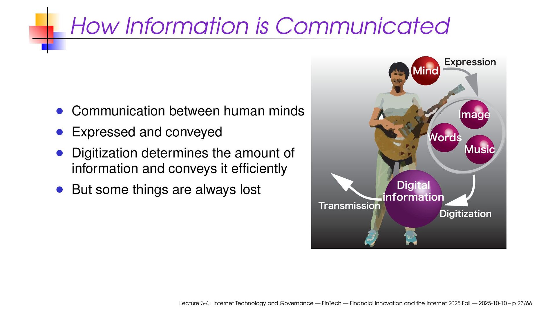 conveyed Digitization determines the amount of information and conveys it efficiently But some things are always lost Lecture 3-4 : Internet Technology and Governance — FinTech — Financial Innovation and the Internet 2025 Fall — 2025-10-10 – p.23/66