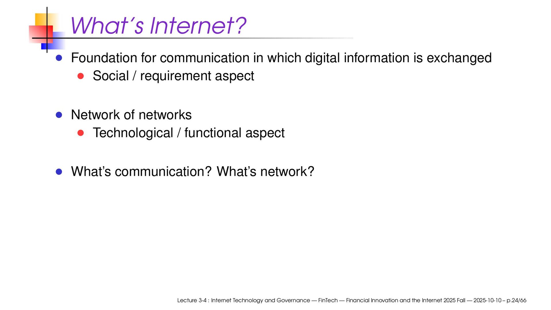 exchanged Social / requirement aspect Network of networks Technological / functional aspect What’s communication? What’s network? Lecture 3-4 : Internet Technology and Governance — FinTech — Financial Innovation and the Internet 2025 Fall — 2025-10-10 – p.24/66