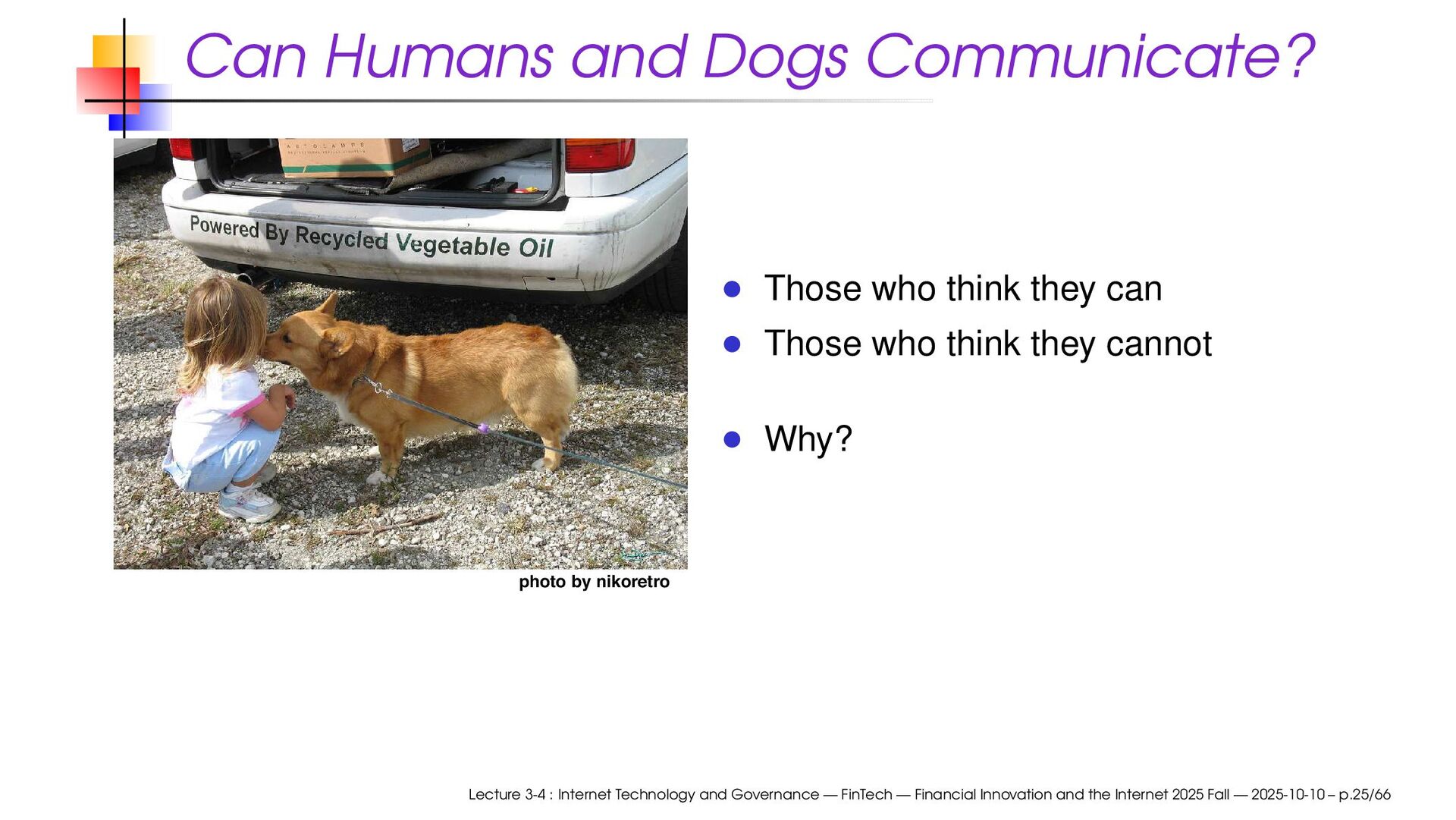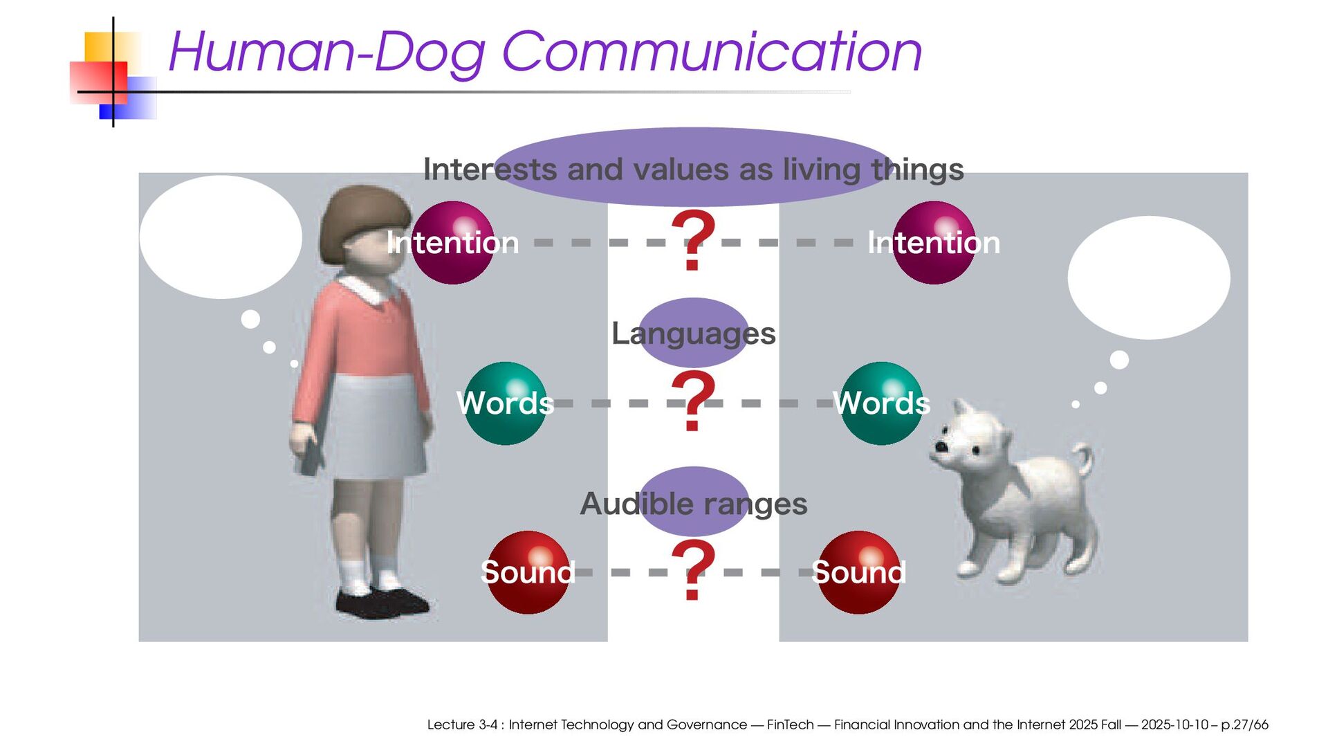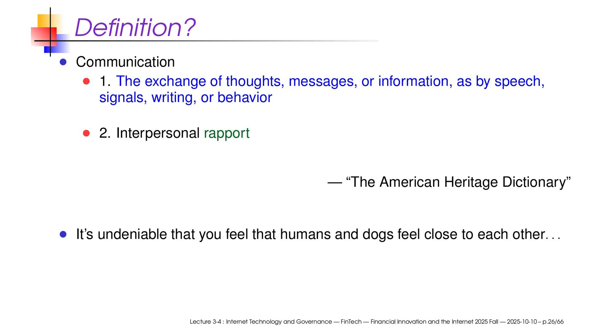 as by speech, signals, writing, or behavior 2. Interpersonal rapport — “The American Heritage Dictionary” It’s undeniable that you feel that humans and dogs feel close to each other . . . Lecture 3-4 : Internet Technology and Governance — FinTech — Financial Innovation and the Internet 2025 Fall — 2025-10-10 – p.26/66