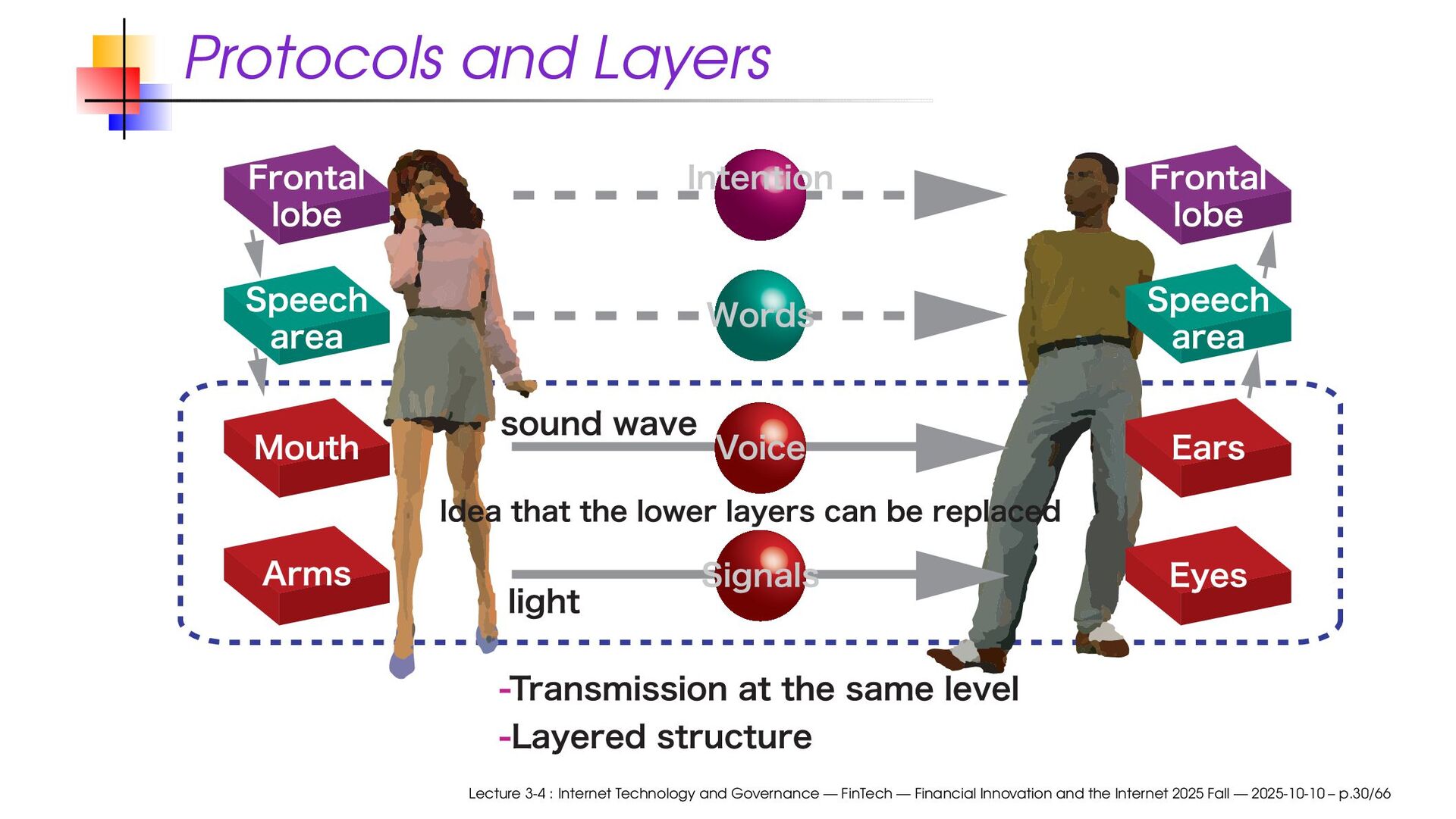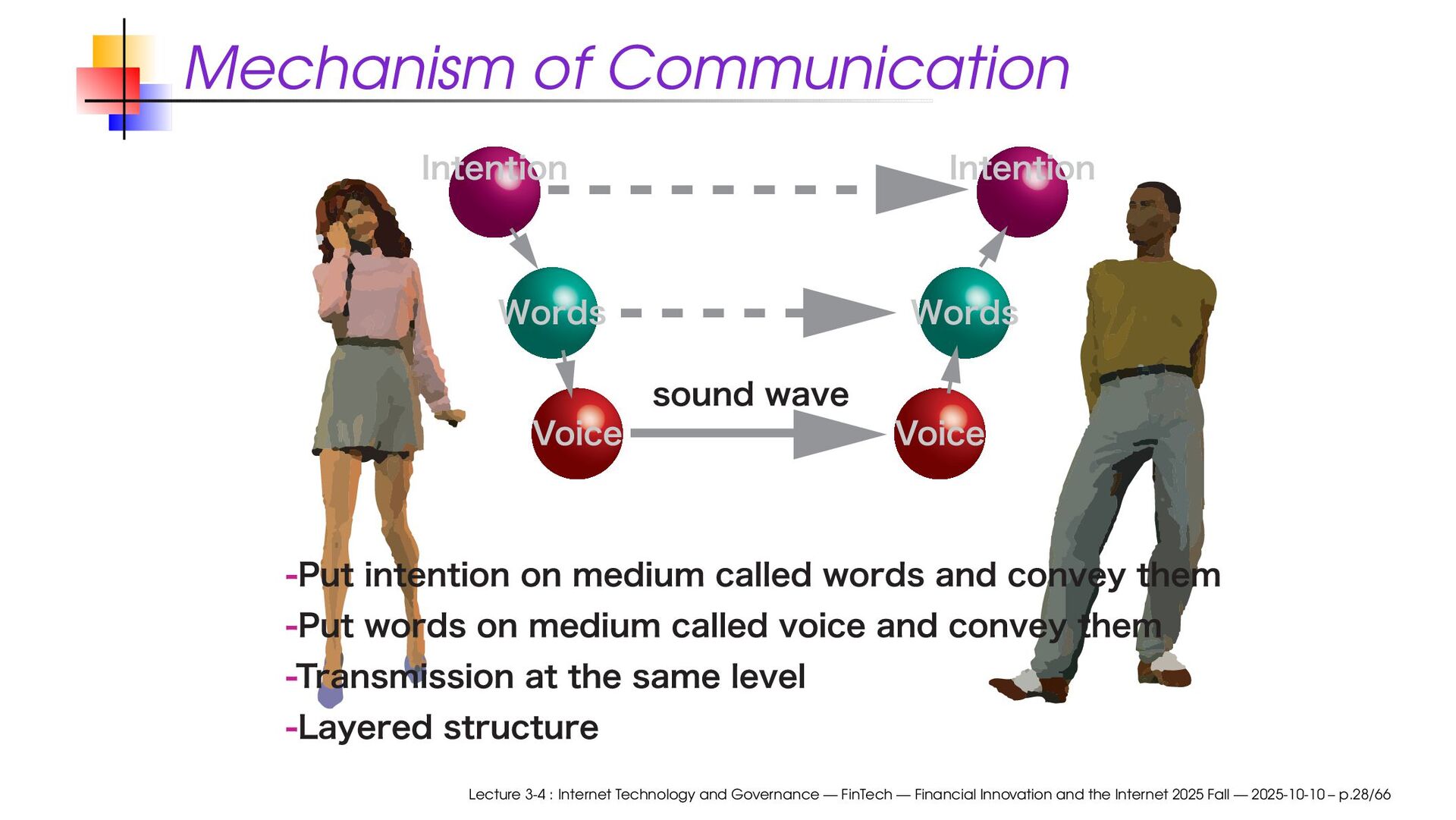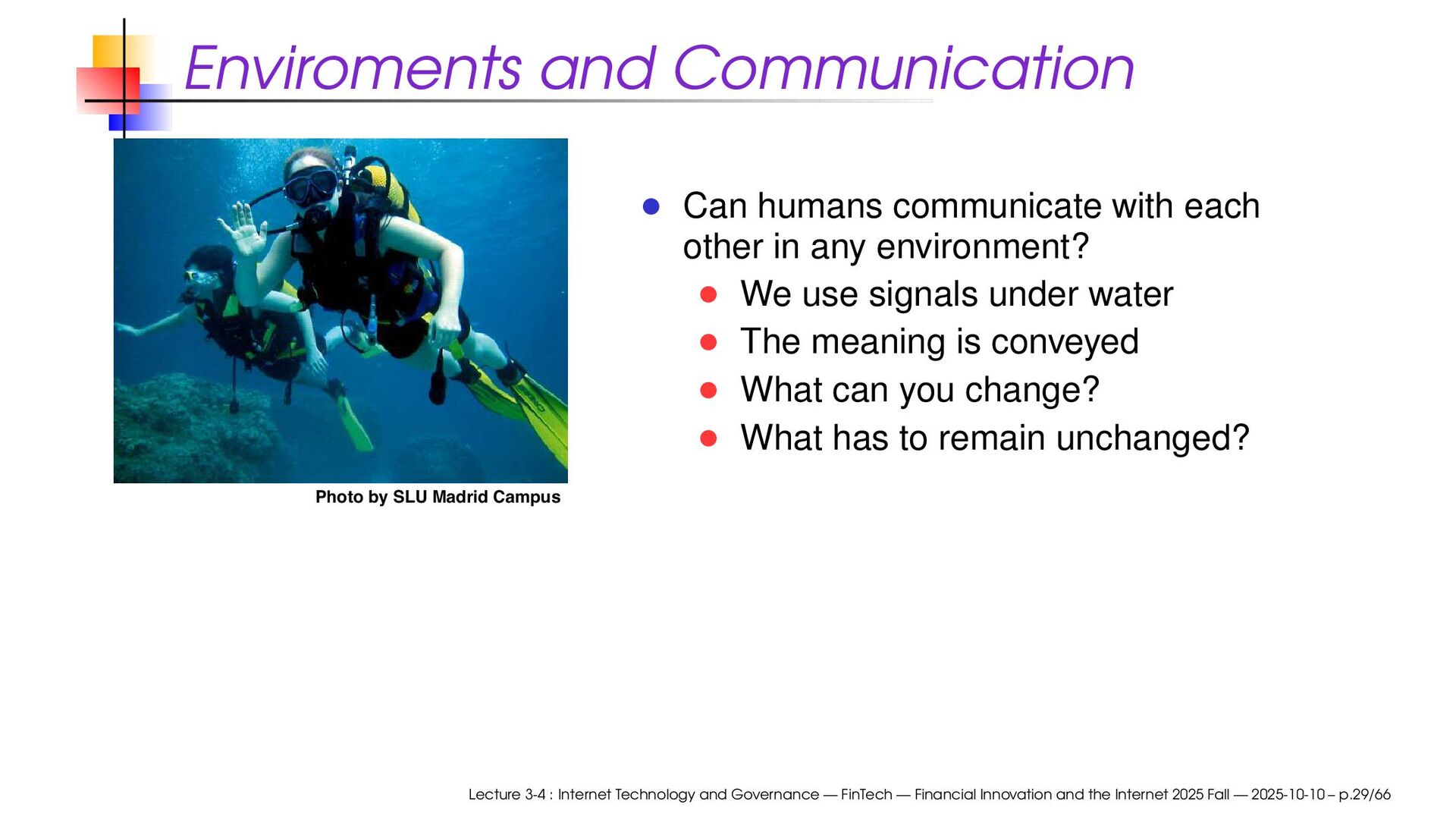 communicate with each other in any environment? We use signals under water The meaning is conveyed What can you change? What has to remain unchanged? Lecture 3-4 : Internet Technology and Governance — FinTech — Financial Innovation and the Internet 2025 Fall — 2025-10-10 – p.29/66