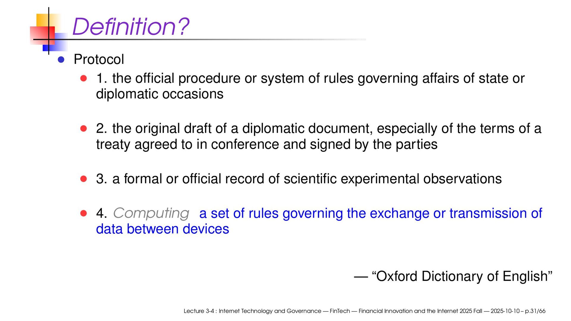 governing affairs of state or diplomatic occasions 2. the original draft of a diplomatic document, especially of the terms of a treaty agreed to in conference and signed by the parties 3. a formal or official record of scientific experimental observations 4. Computing a set of rules governing the exchange or transmission of data between devices — “Oxford Dictionary of English” Lecture 3-4 : Internet Technology and Governance — FinTech — Financial Innovation and the Internet 2025 Fall — 2025-10-10 – p.31/66