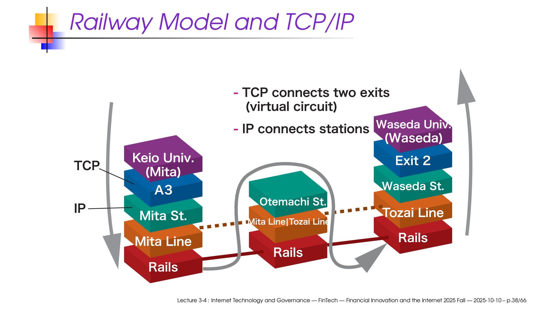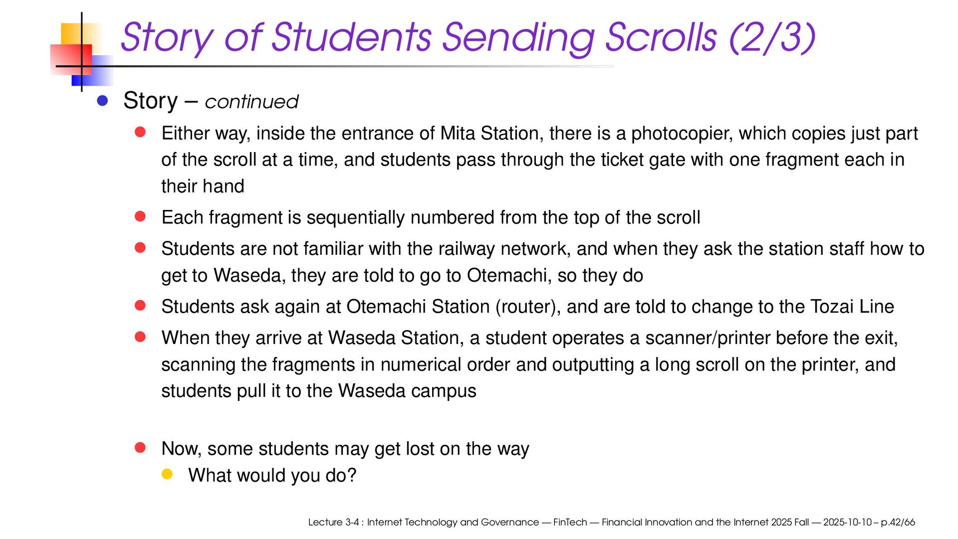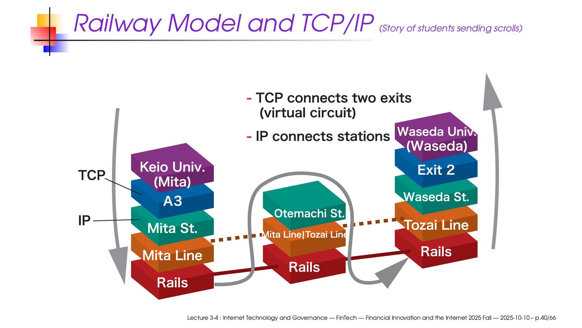 way, inside the entrance of Mita Station, there is a photocopier, which copies just part of the scroll at a time, and students pass through the ticket gate with one fragment each in their hand Each fragment is sequentially numbered from the top of the scroll Students are not familiar with the railway network, and when they ask the station staff how to get to Waseda, they are told to go to Otemachi, so they do Students ask again at Otemachi Station (router), and are told to change to the Tozai Line When they arrive at Waseda Station, a student operates a scanner/printer before the exit, scanning the fragments in numerical order and outputting a long scroll on the printer, and students pull it to the Waseda campus Now, some students may get lost on the way What would you do? Lecture 3-4 : Internet Technology and Governance — FinTech — Financial Innovation and the Internet 2025 Fall — 2025-10-10 – p.42/66