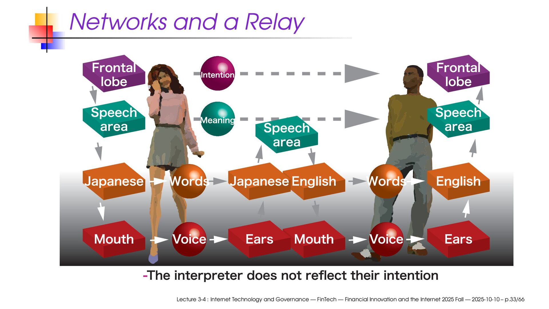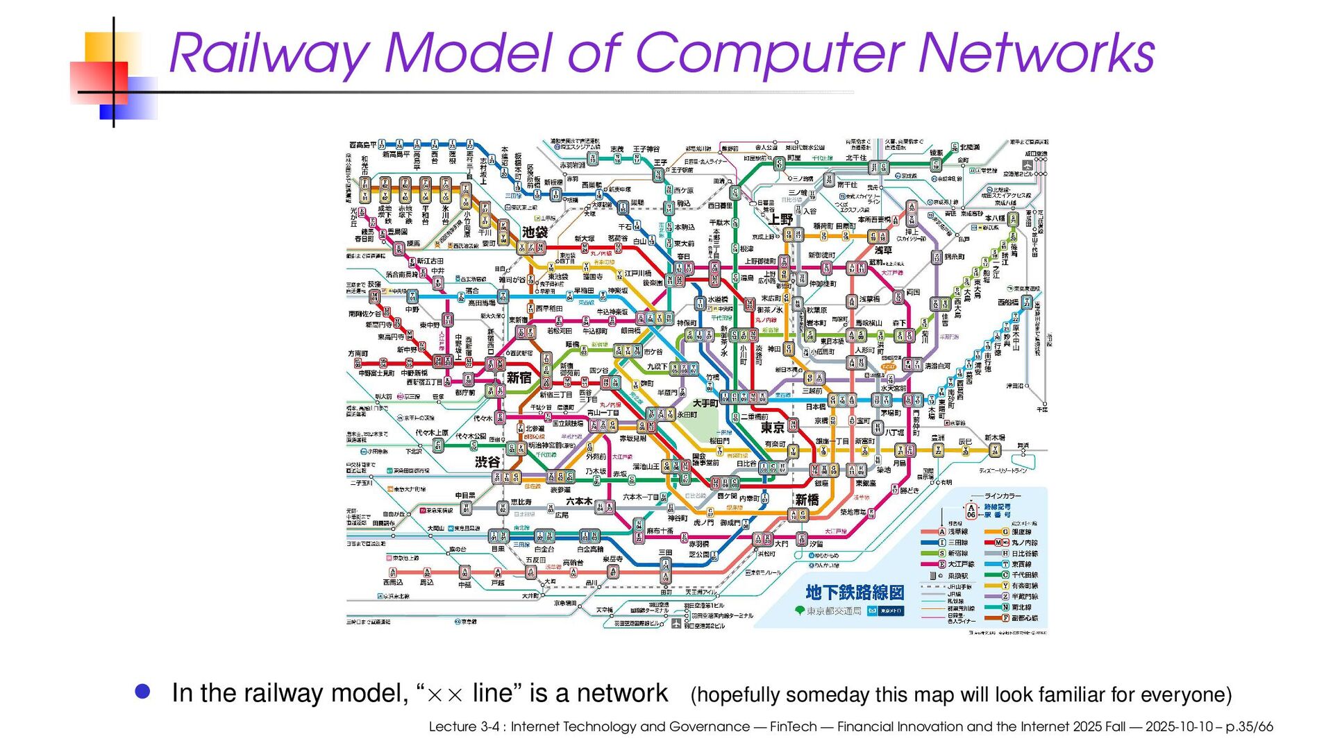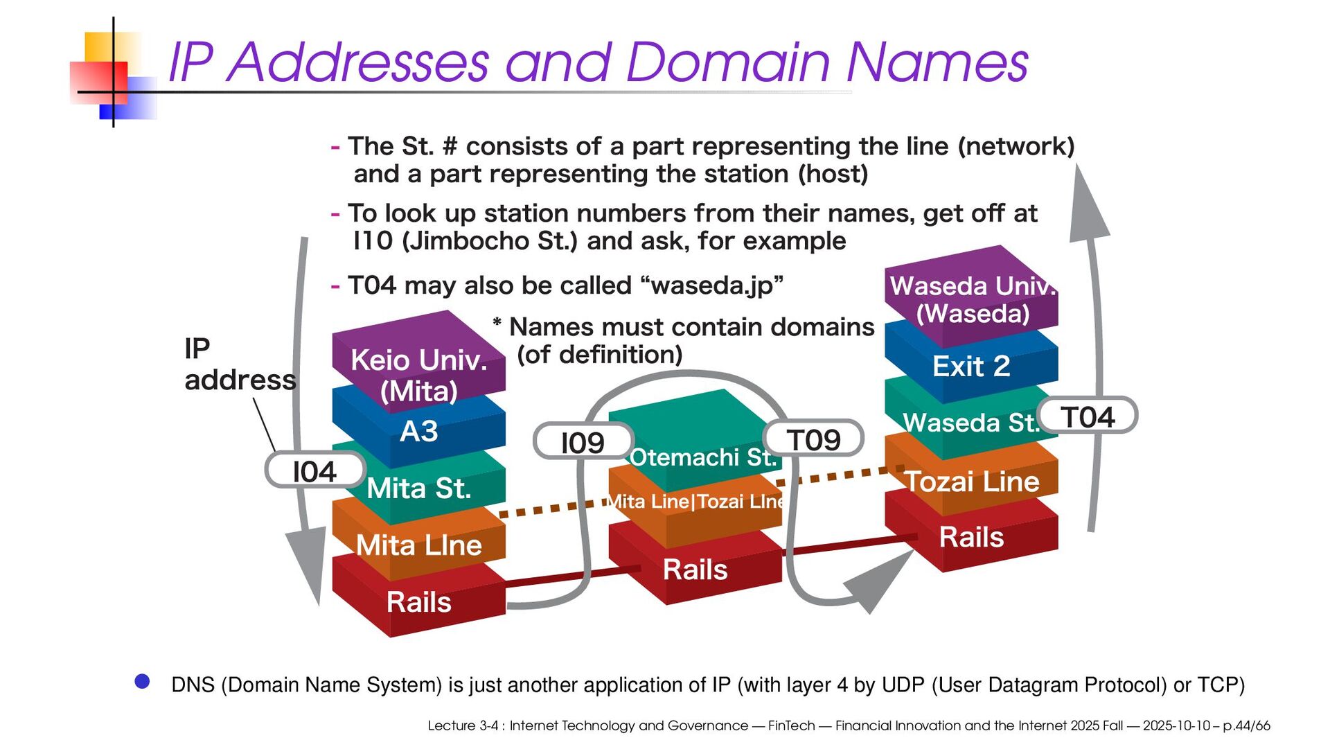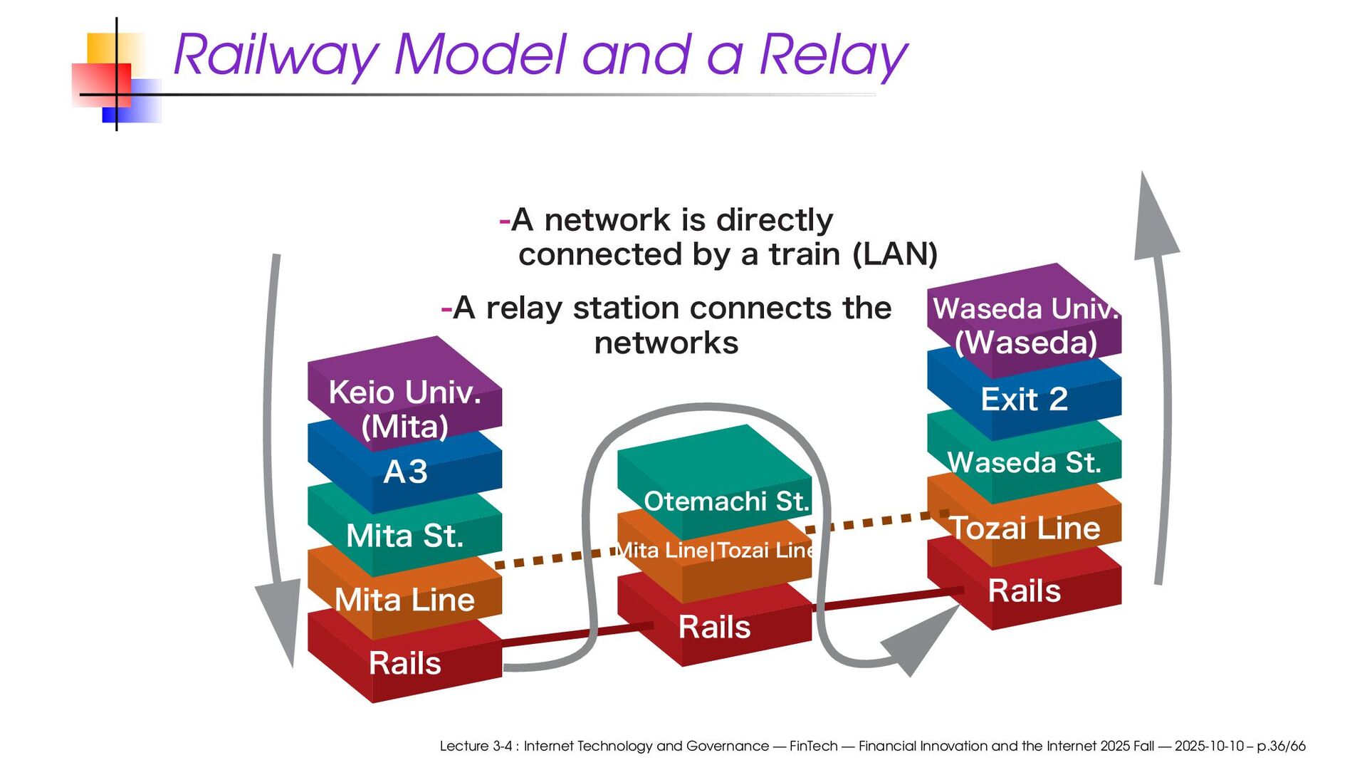 way, inside the entrance of Mita Station, there is a photocopier, which copies just part of the scroll at a time, and students pass through the ticket gate with one fragment each in their hand Each fragment is sequentially numbered from the top of the scroll Students are not familiar with the railway network, and when they ask the station staff how to get to Waseda, they are told to go to Otemachi, so they do Students ask again at Otemachi Station (router), and are told to change to the Tozai Line When they arrive at Waseda Station, a student operates a scanner/printer before the exit, scanning the fragments in numerical order and outputting a long scroll on the printer, and students pull it to the Waseda campus Now, some students may get lost on the way What would you do? Lecture 3-4 : Internet Technology and Governance — FinTech — Financial Innovation and the Internet 2025 Fall — 2025-10-10 – p.42/66