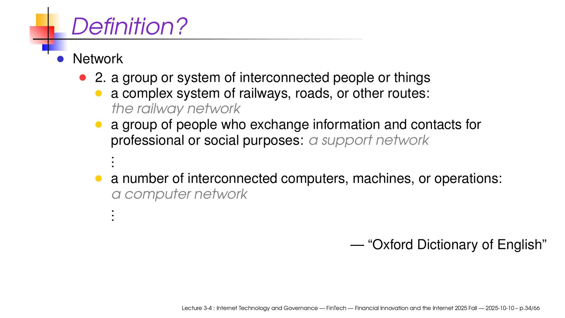 or things a complex system of railways, roads, or other routes: the railway network a group of people who exchange information and contacts for professional or social purposes: a support network . . . a number of interconnected computers, machines, or operations: a computer network . . . — “Oxford Dictionary of English” Lecture 3-4 : Internet Technology and Governance — FinTech — Financial Innovation and the Internet 2025 Fall — 2025-10-10 – p.34/66