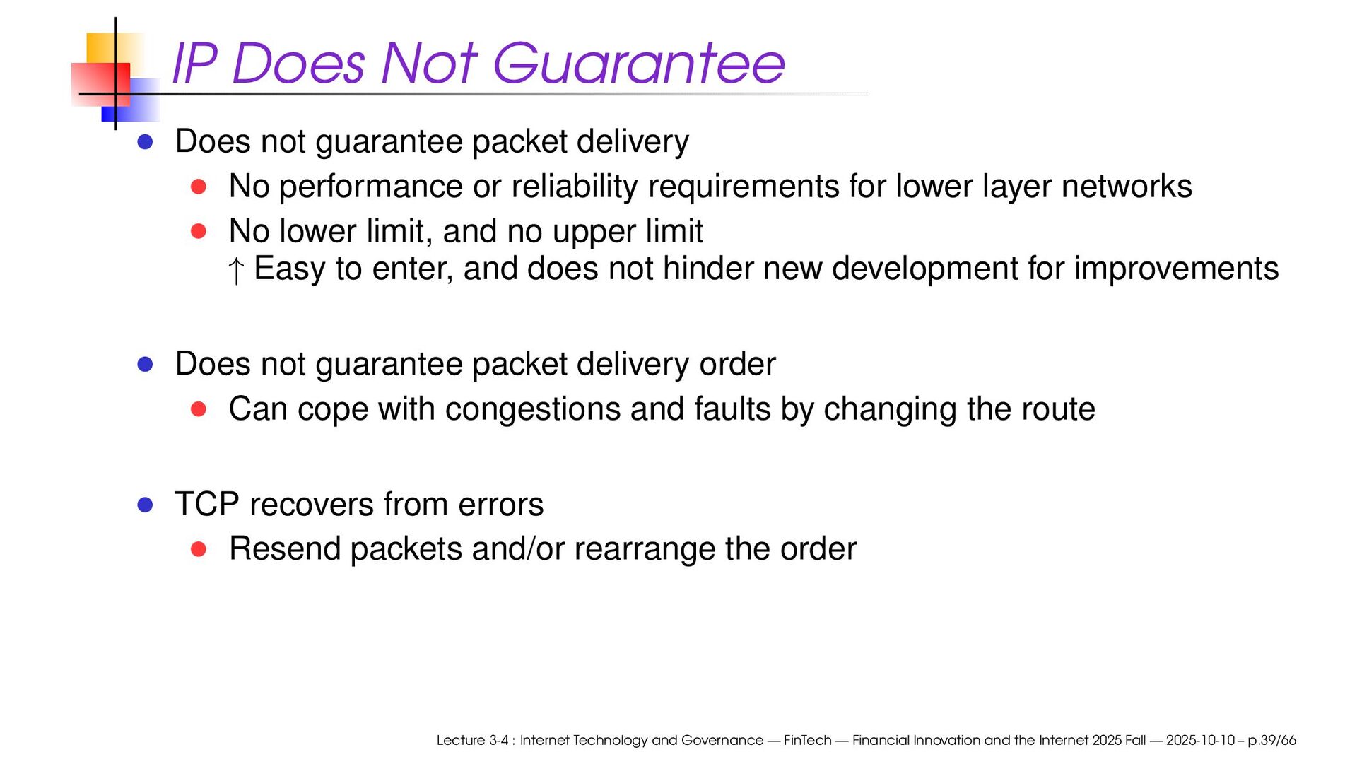 performance or reliability requirements for lower layer networks No lower limit, and no upper limit ↑ Easy to enter, and does not hinder new development for improvements Does not guarantee packet delivery order Can cope with congestions and faults by changing the route TCP recovers from errors Resend packets and/or rearrange the order Lecture 3-4 : Internet Technology and Governance — FinTech — Financial Innovation and the Internet 2025 Fall — 2025-10-10 – p.39/66