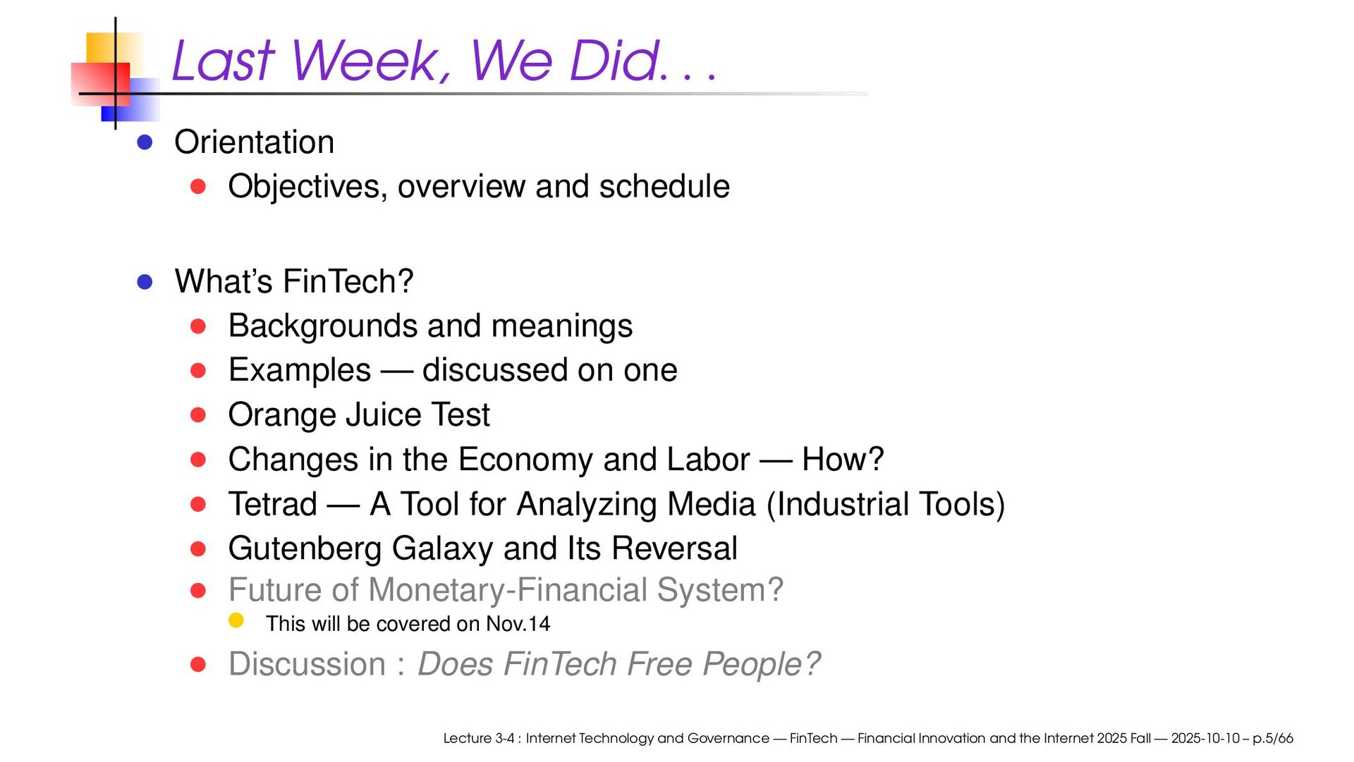 and schedule What’s FinTech? Backgrounds and meanings Examples — discussed on one Orange Juice Test Changes in the Economy and Labor — How? Tetrad — A Tool for Analyzing Media (Industrial Tools) Gutenberg Galaxy and Its Reversal Future of Monetary-Financial System? This will be covered on Nov.14 Discussion : Does FinTech Free People? Lecture 3-4 : Internet Technology and Governance — FinTech — Financial Innovation and the Internet 2025 Fall — 2025-10-10 – p.5/66