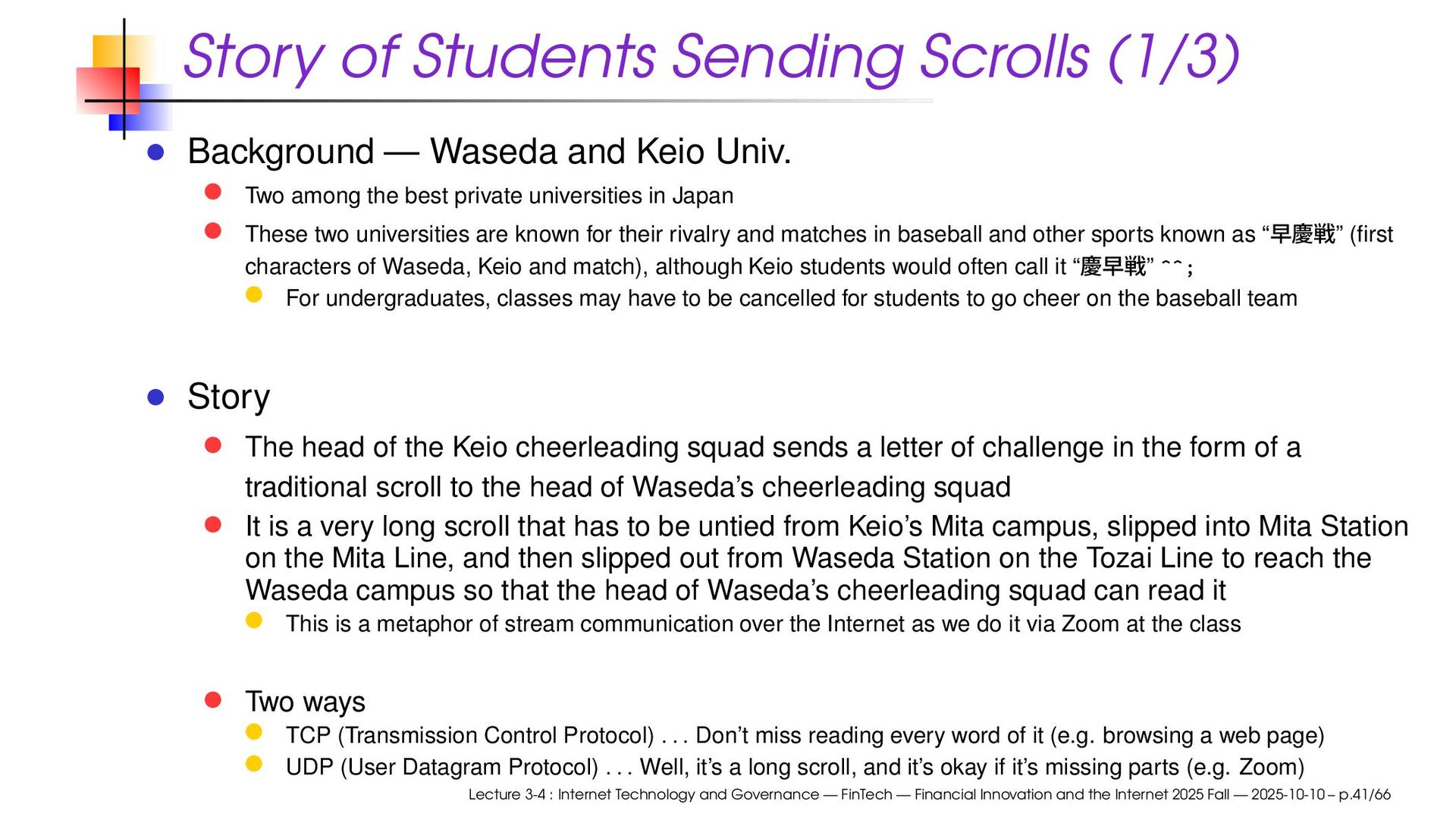 Keio Univ. Two among the best private universities in Japan These two universities are known for their rivalry and matches in baseball and other sports known as “ ” (first characters of Waseda, Keio and match), although Keio students would often call it “ ” ^^; For undergraduates, classes may have to be cancelled for students to go cheer on the baseball team Story The head of the Keio cheerleading squad sends a letter of challenge in the form of a traditional scroll to the head of Waseda’s cheerleading squad It is a very long scroll that has to be untied from Keio’s Mita campus, slipped into Mita Station on the Mita Line, and then slipped out from Waseda Station on the Tozai Line to reach the Waseda campus so that the head of Waseda’s cheerleading squad can read it This is a metaphor of stream communication over the Internet as we do it via Zoom at the class Two ways TCP (Transmission Control Protocol) . . . Don’t miss reading every word of it (e.g. browsing a web page) UDP (User Datagram Protocol) . . . Well, it’s a long scroll, and it’s okay if it’s missing parts (e.g. Zoom) Lecture 3-4 : Internet Technology and Governance — FinTech — Financial Innovation and the Internet 2025 Fall — 2025-10-10 – p.41/66