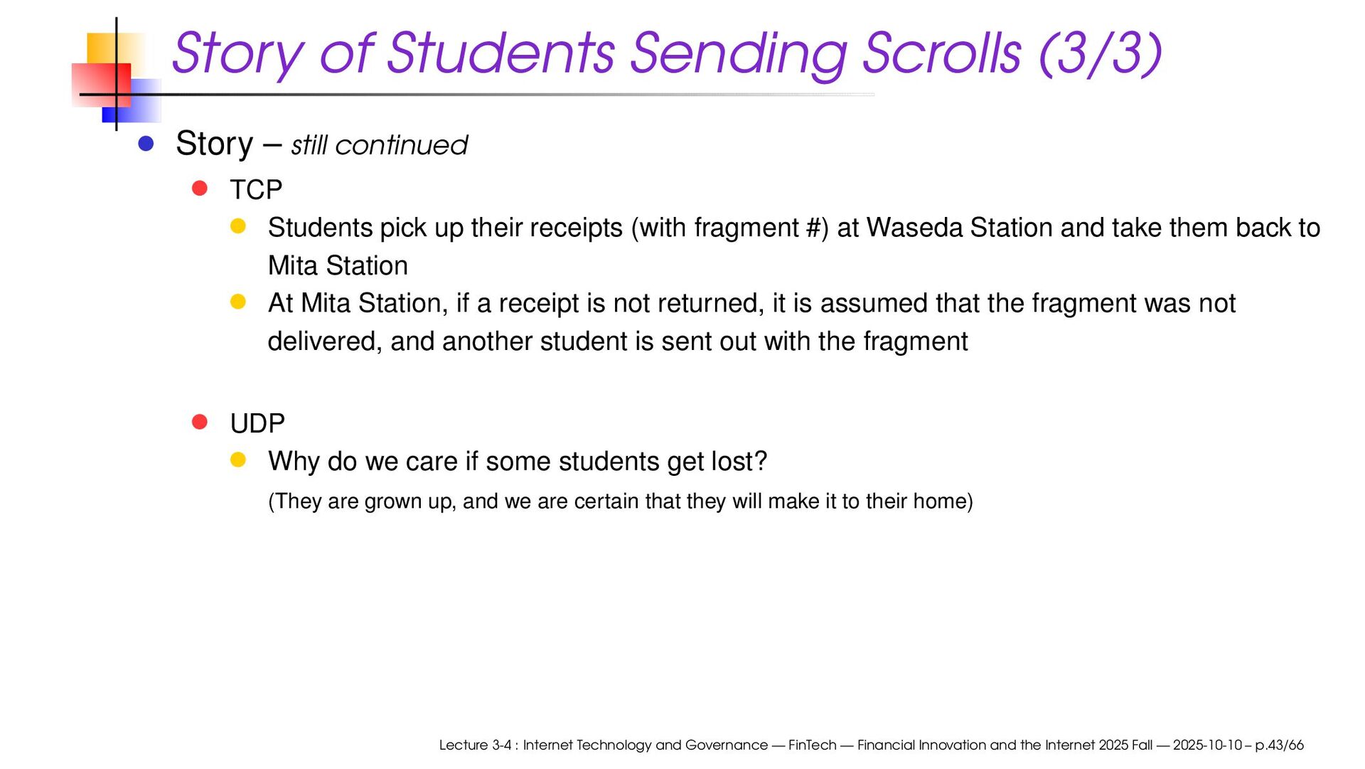 TCP Students pick up their receipts (with fragment #) at Waseda Station and take them back to Mita Station At Mita Station, if a receipt is not returned, it is assumed that the fragment was not delivered, and another student is sent out with the fragment UDP Why do we care if some students get lost? (They are grown up, and we are certain that they will make it to their home) Lecture 3-4 : Internet Technology and Governance — FinTech — Financial Innovation and the Internet 2025 Fall — 2025-10-10 – p.43/66