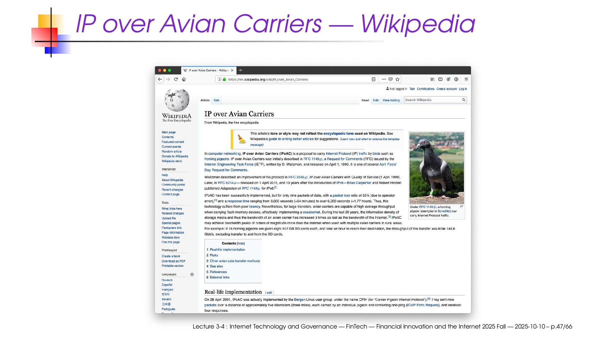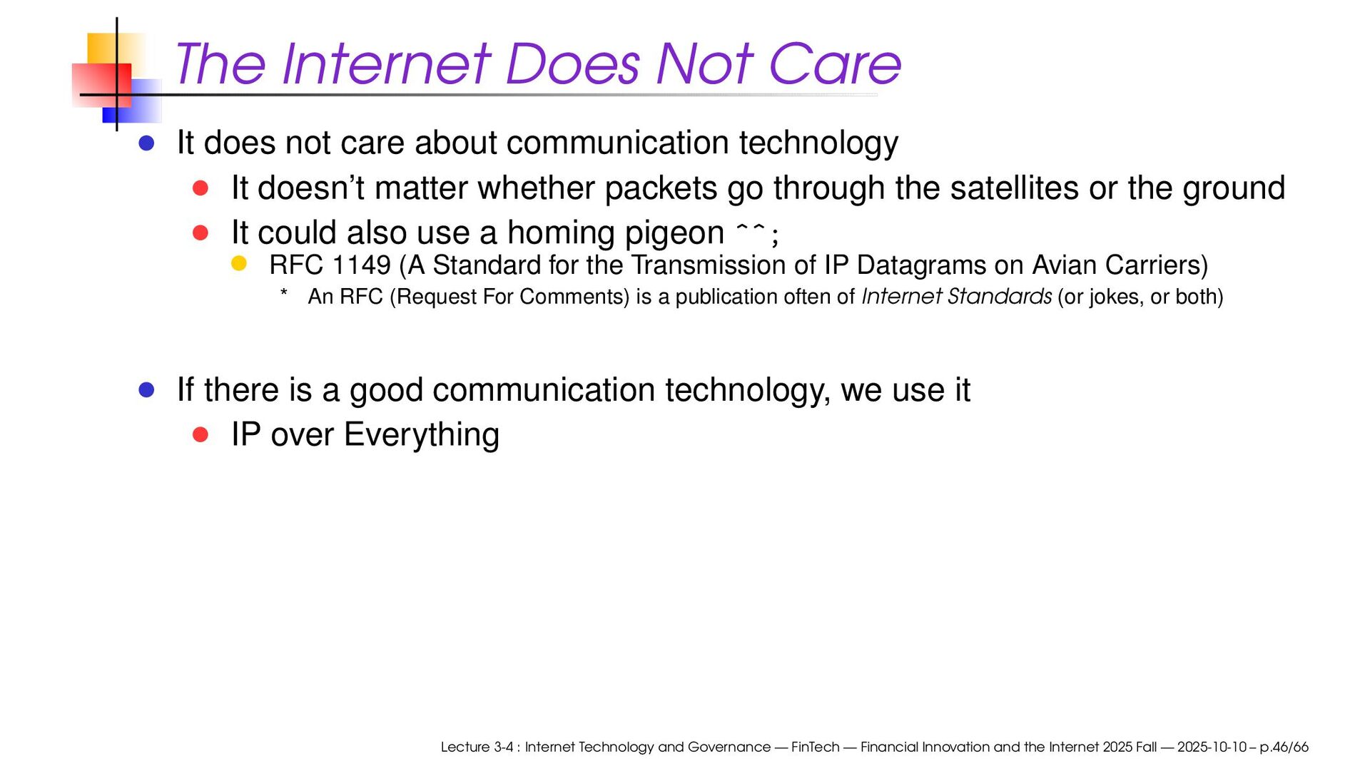 communication technology It doesn’t matter whether packets go through the satellites or the ground It could also use a homing pigeon ^^; RFC 1149 (A Standard for the Transmission of IP Datagrams on Avian Carriers) * An RFC (Request For Comments) is a publication often of Internet Standards (or jokes, or both) If there is a good communication technology, we use it IP over Everything Lecture 3-4 : Internet Technology and Governance — FinTech — Financial Innovation and the Internet 2025 Fall — 2025-10-10 – p.46/66