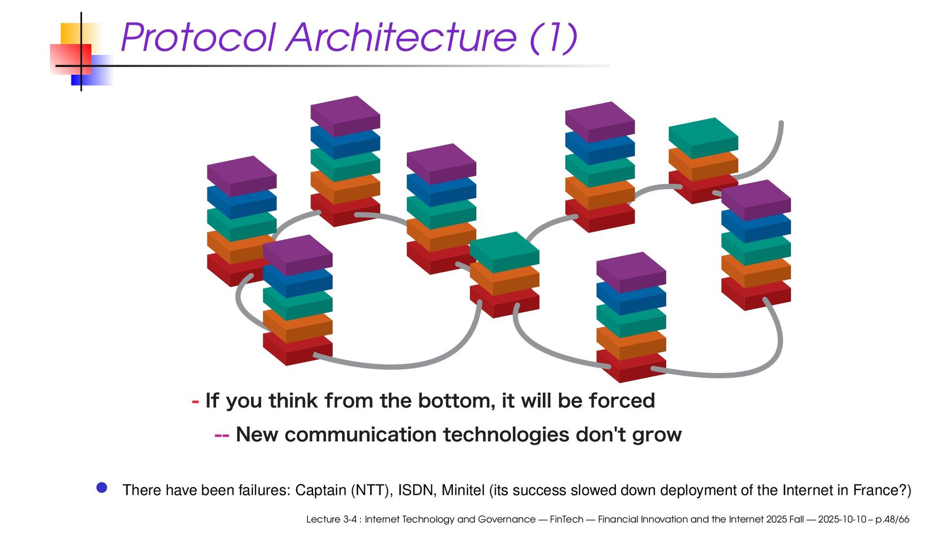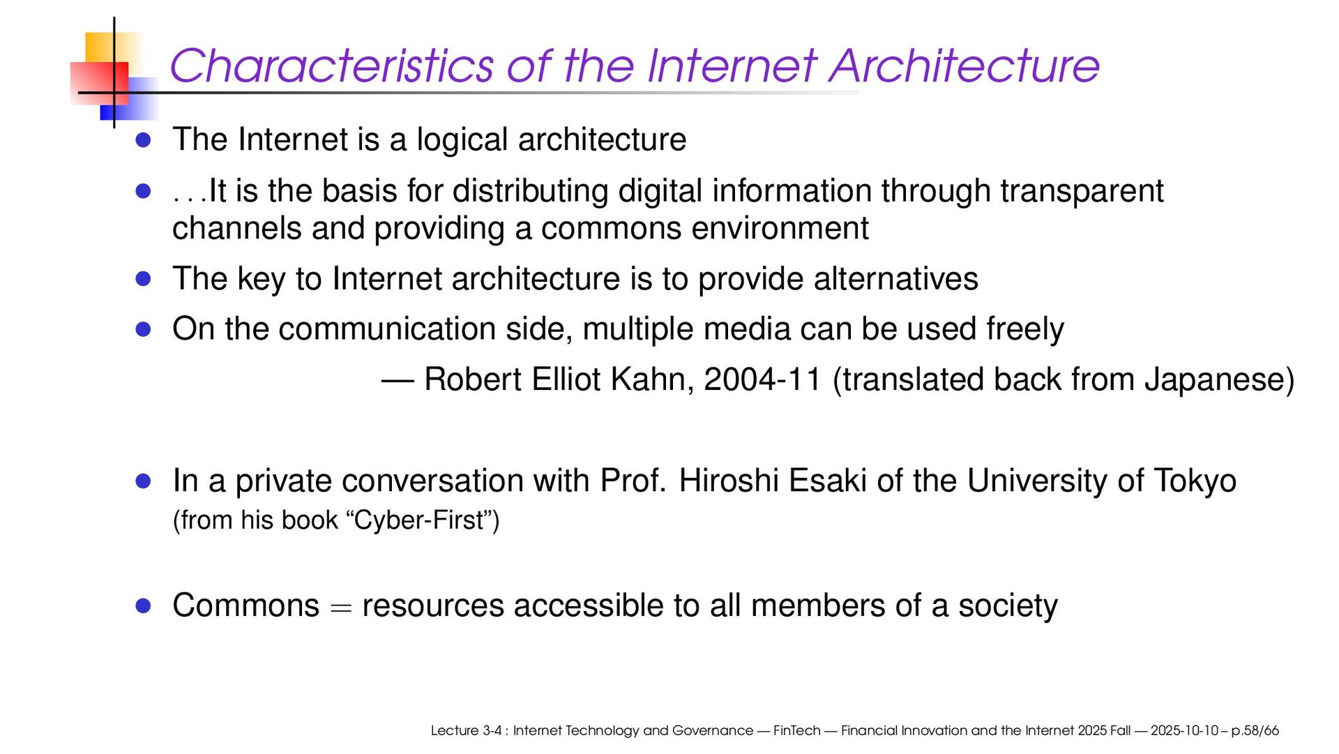 architecture . . . It is the basis for distributing digital information through transparent channels and providing a commons environment The key to Internet architecture is to provide alternatives On the communication side, multiple media can be used freely — Robert Elliot Kahn, 2004-11 (translated back from Japanese) In a private conversation with Prof. Hiroshi Esaki of the University of Tokyo (from his book “Cyber-First”) Commons = resources accessible to all members of a society Lecture 3-4 : Internet Technology and Governance — FinTech — Financial Innovation and the Internet 2025 Fall — 2025-10-10 – p.58/66