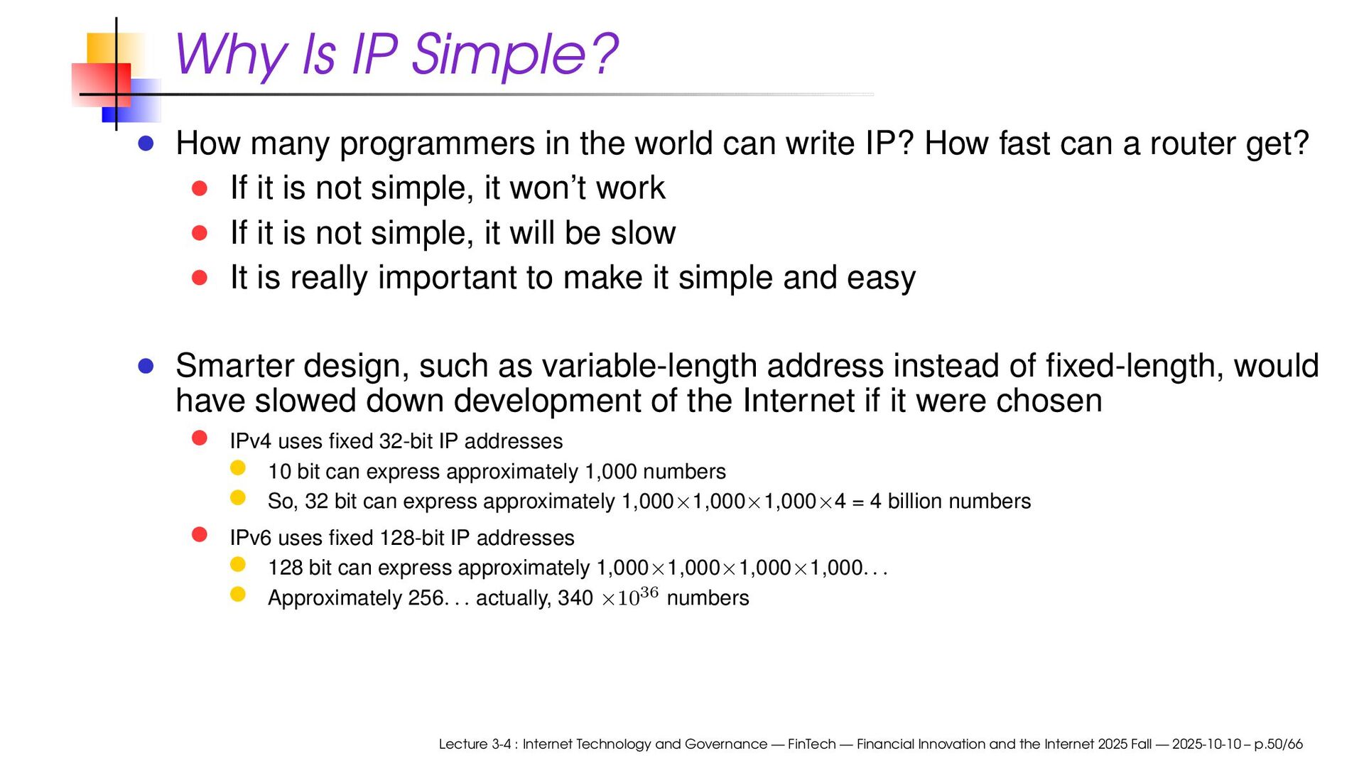 can write IP? How fast can a router get? If it is not simple, it won’t work If it is not simple, it will be slow It is really important to make it simple and easy Smarter design, such as variable-length address instead of fixed-length, would have slowed down development of the Internet if it were chosen IPv4 uses fixed 32-bit IP addresses 10 bit can express approximately 1,000 numbers So, 32 bit can express approximately 1,000×1,000×1,000×4 = 4 billion numbers IPv6 uses fixed 128-bit IP addresses 128 bit can express approximately 1,000×1,000×1,000×1,000 .. . Approximately 256 . . . actually, 340 ×1036 numbers Lecture 3-4 : Internet Technology and Governance — FinTech — Financial Innovation and the Internet 2025 Fall — 2025-10-10 – p.50/66