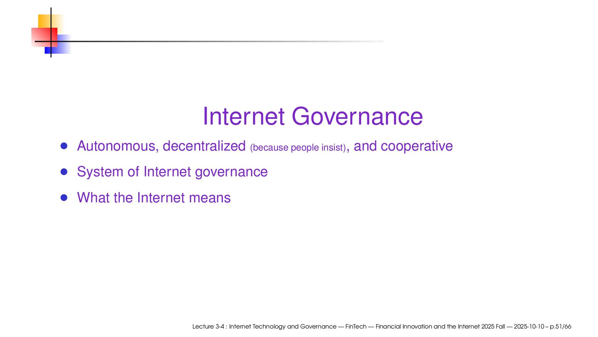 of Internet governance What the Internet means Lecture 3-4 : Internet Technology and Governance — FinTech — Financial Innovation and the Internet 2025 Fall — 2025-10-10 – p.51/66