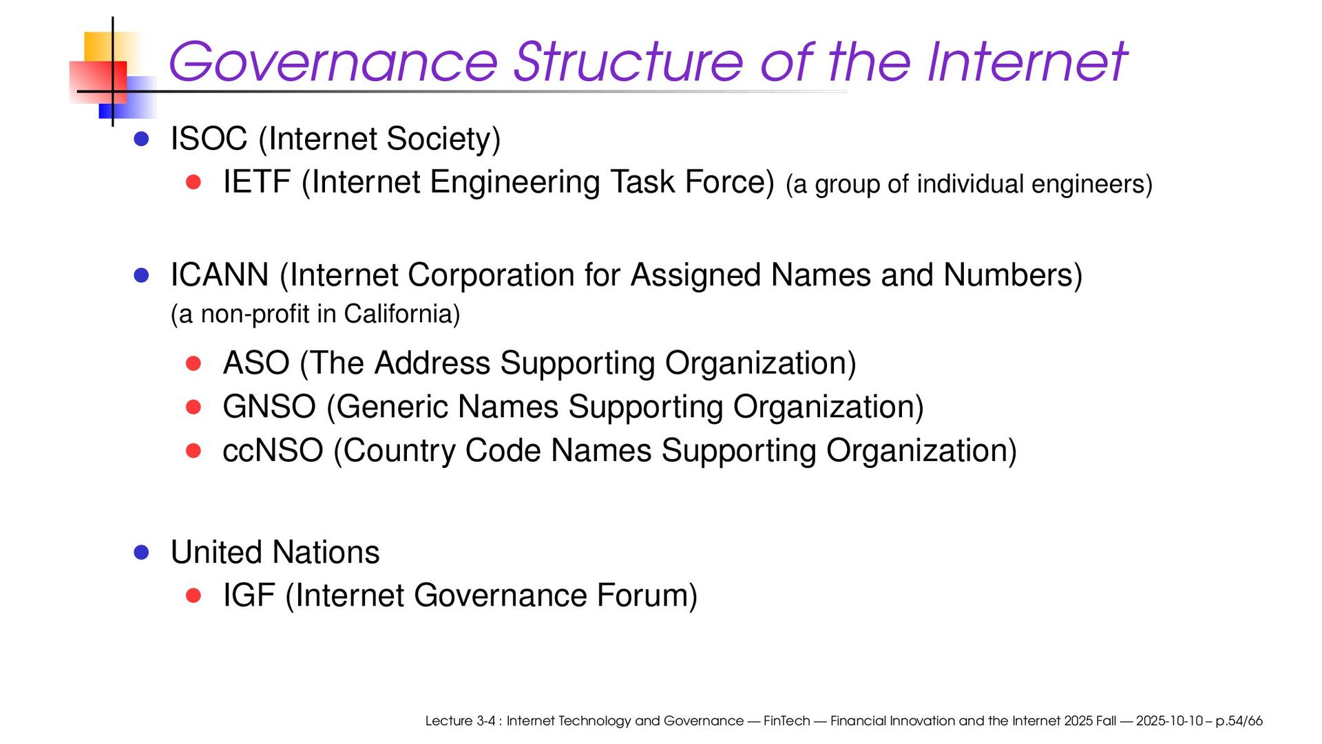 Engineering Task Force) (a group of individual engineers) ICANN (Internet Corporation for Assigned Names and Numbers) (a non-profit in California) ASO (The Address Supporting Organization) GNSO (Generic Names Supporting Organization) ccNSO (Country Code Names Supporting Organization) United Nations IGF (Internet Governance Forum) Lecture 3-4 : Internet Technology and Governance — FinTech — Financial Innovation and the Internet 2025 Fall — 2025-10-10 – p.54/66