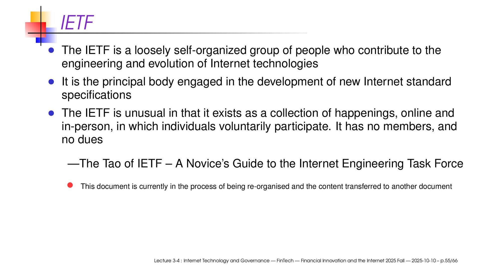 who contribute to the engineering and evolution of Internet technologies It is the principal body engaged in the development of new Internet standard specifications The IETF is unusual in that it exists as a collection of happenings, online and in-person, in which individuals voluntarily participate. It has no members, and no dues —The Tao of IETF – A Novice’s Guide to the Internet Engineering Task Force This document is currently in the process of being re-organised and the content transferred to another document Lecture 3-4 : Internet Technology and Governance — FinTech — Financial Innovation and the Internet 2025 Fall — 2025-10-10 – p.55/66