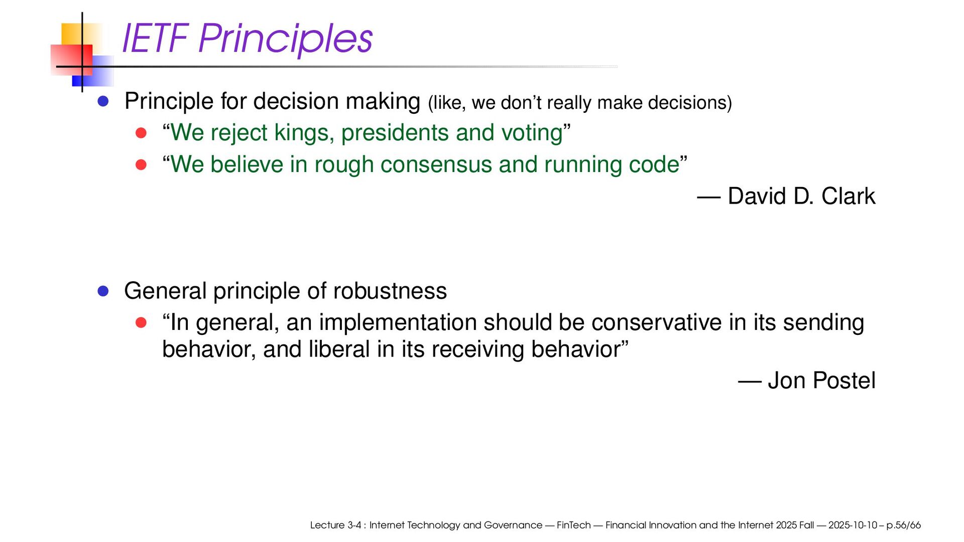 make decisions) “We reject kings, presidents and voting” “We believe in rough consensus and running code” — David D. Clark General principle of robustness “In general, an implementation should be conservative in its sending behavior, and liberal in its receiving behavior” — Jon Postel Lecture 3-4 : Internet Technology and Governance — FinTech — Financial Innovation and the Internet 2025 Fall — 2025-10-10 – p.56/66
