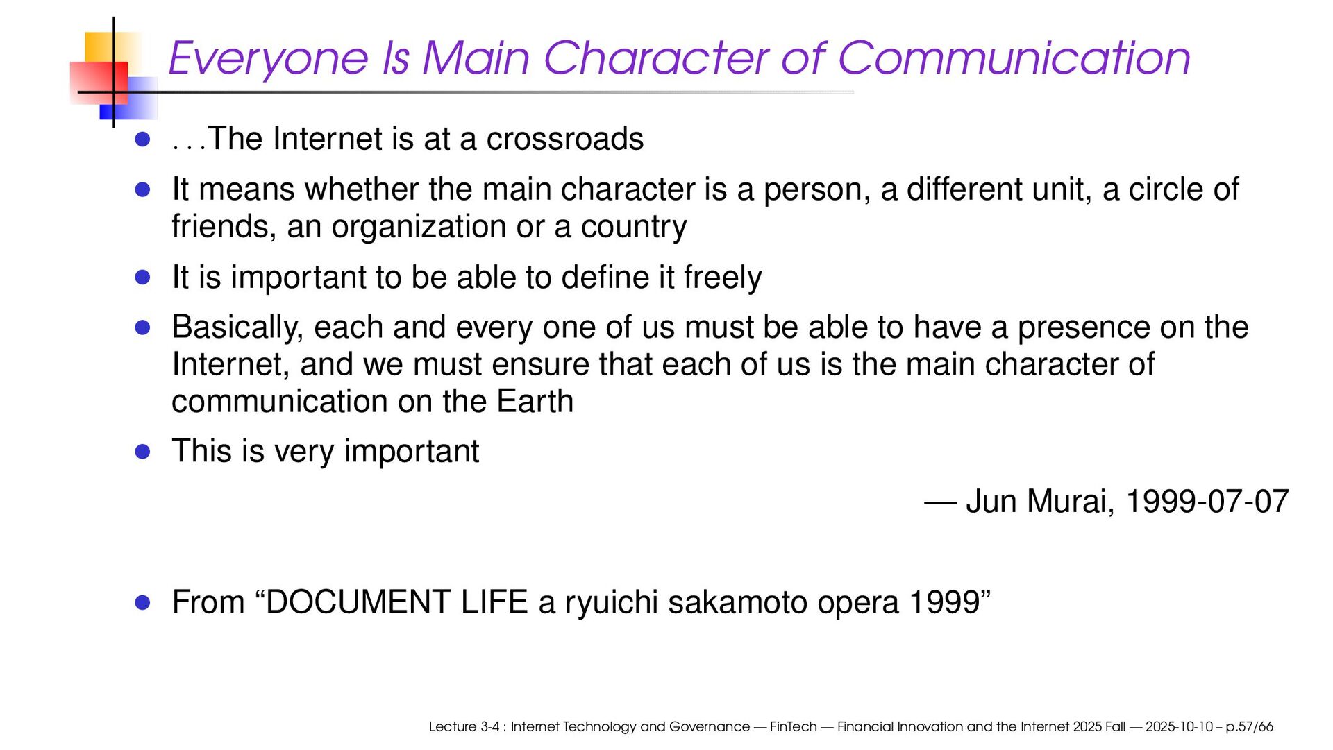 Internet is at a crossroads It means whether the main character is a person, a different unit, a circle of friends, an organization or a country It is important to be able to define it freely Basically, each and every one of us must be able to have a presence on the Internet, and we must ensure that each of us is the main character of communication on the Earth This is very important — Jun Murai, 1999-07-07 From “DOCUMENT LIFE a ryuichi sakamoto opera 1999” Lecture 3-4 : Internet Technology and Governance — FinTech — Financial Innovation and the Internet 2025 Fall — 2025-10-10 – p.57/66