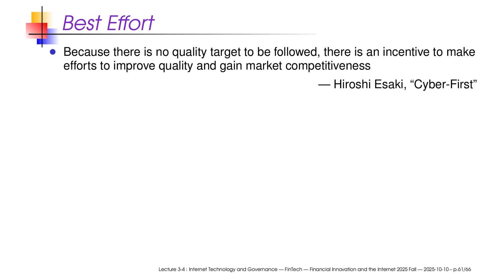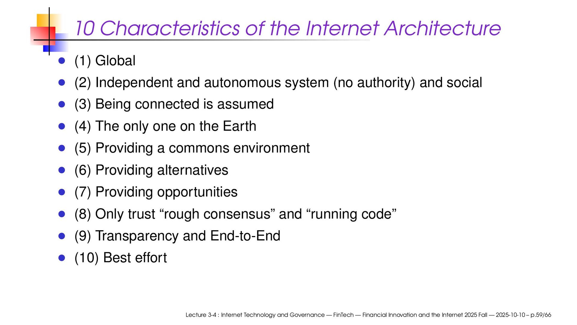and autonomous system (no authority) and social (3) Being connected is assumed (4) The only one on the Earth (5) Providing a commons environment (6) Providing alternatives (7) Providing opportunities (8) Only trust “rough consensus” and “running code” (9) Transparency and End-to-End (10) Best effort Lecture 3-4 : Internet Technology and Governance — FinTech — Financial Innovation and the Internet 2025 Fall — 2025-10-10 – p.59/66