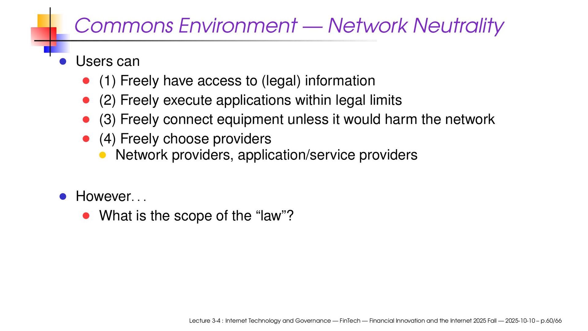 access to (legal) information (2) Freely execute applications within legal limits (3) Freely connect equipment unless it would harm the network (4) Freely choose providers Network providers, application/service providers However . . . What is the scope of the “law”? Lecture 3-4 : Internet Technology and Governance — FinTech — Financial Innovation and the Internet 2025 Fall — 2025-10-10 – p.60/66