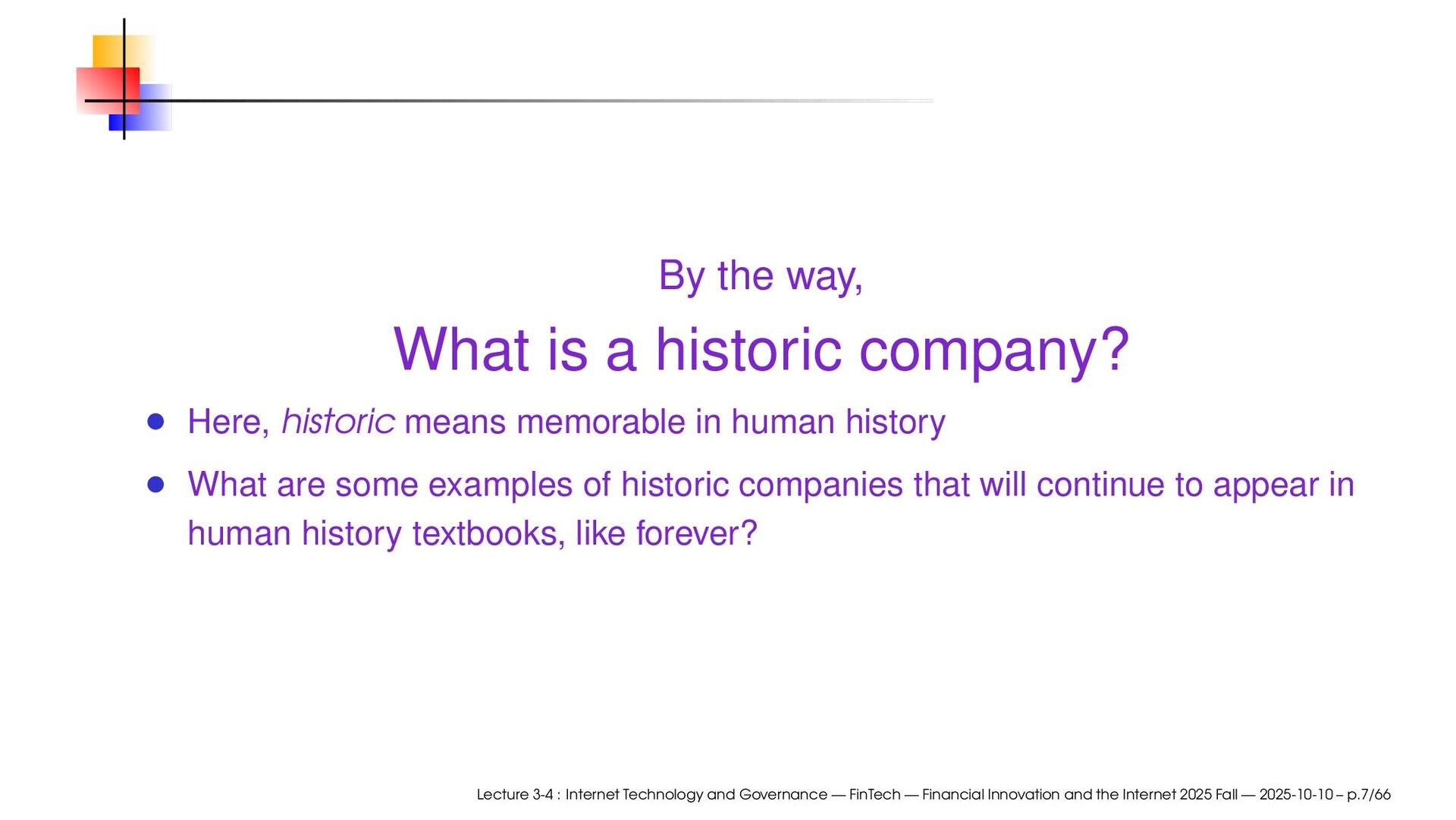 means memorable in human history What are some examples of historic companies that will continue to appear in human history textbooks, like forever? Lecture 3-4 : Internet Technology and Governance — FinTech — Financial Innovation and the Internet 2025 Fall — 2025-10-10 – p.7/66